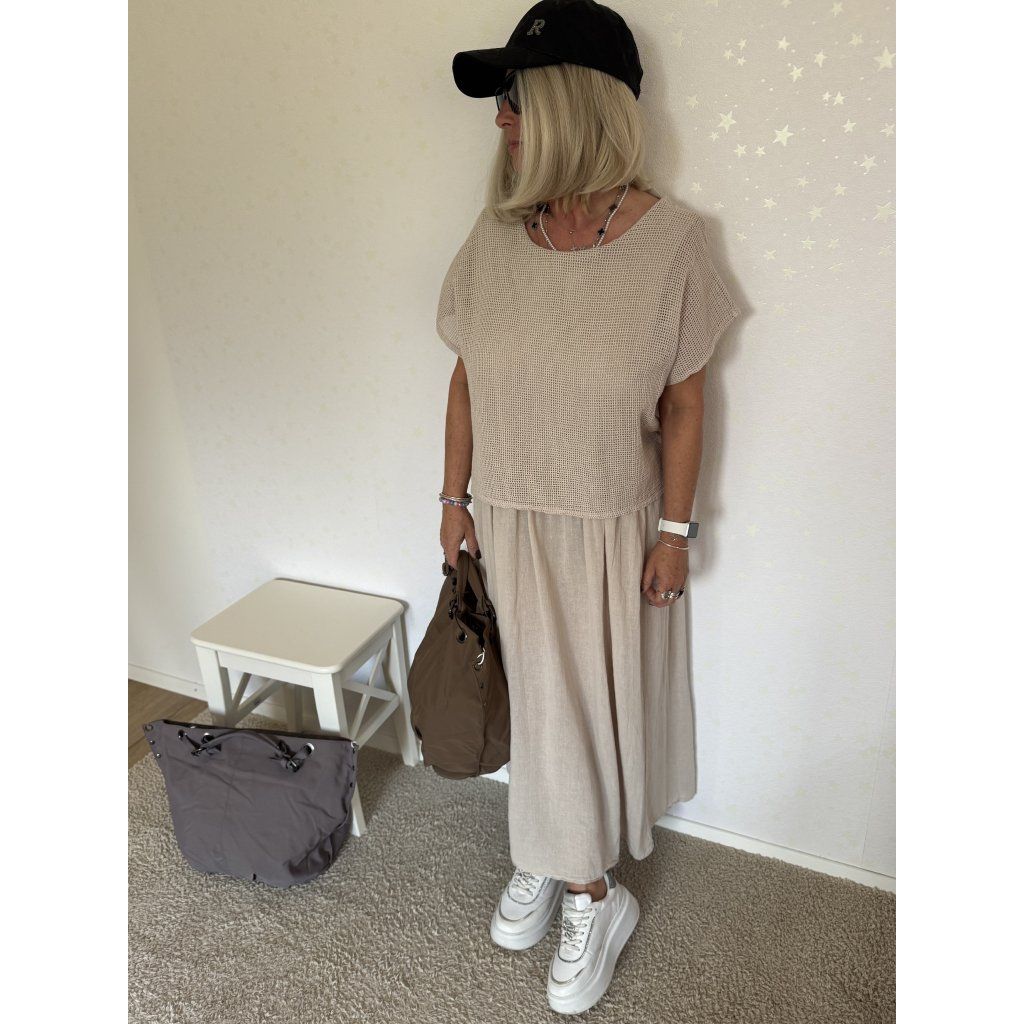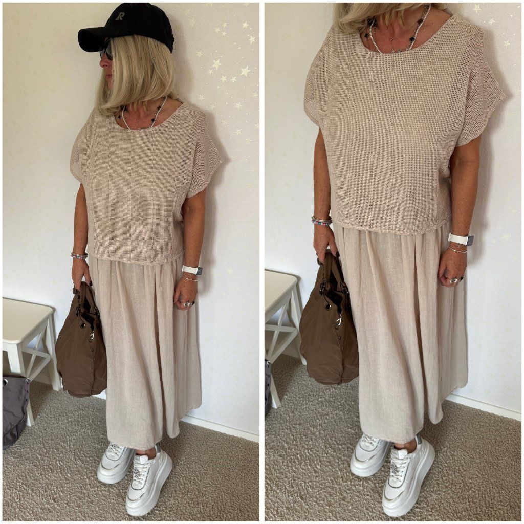 Prodyšný úpletový top s krátkým rukávem a volná lněná sukně s příjemným splývavým střihem.