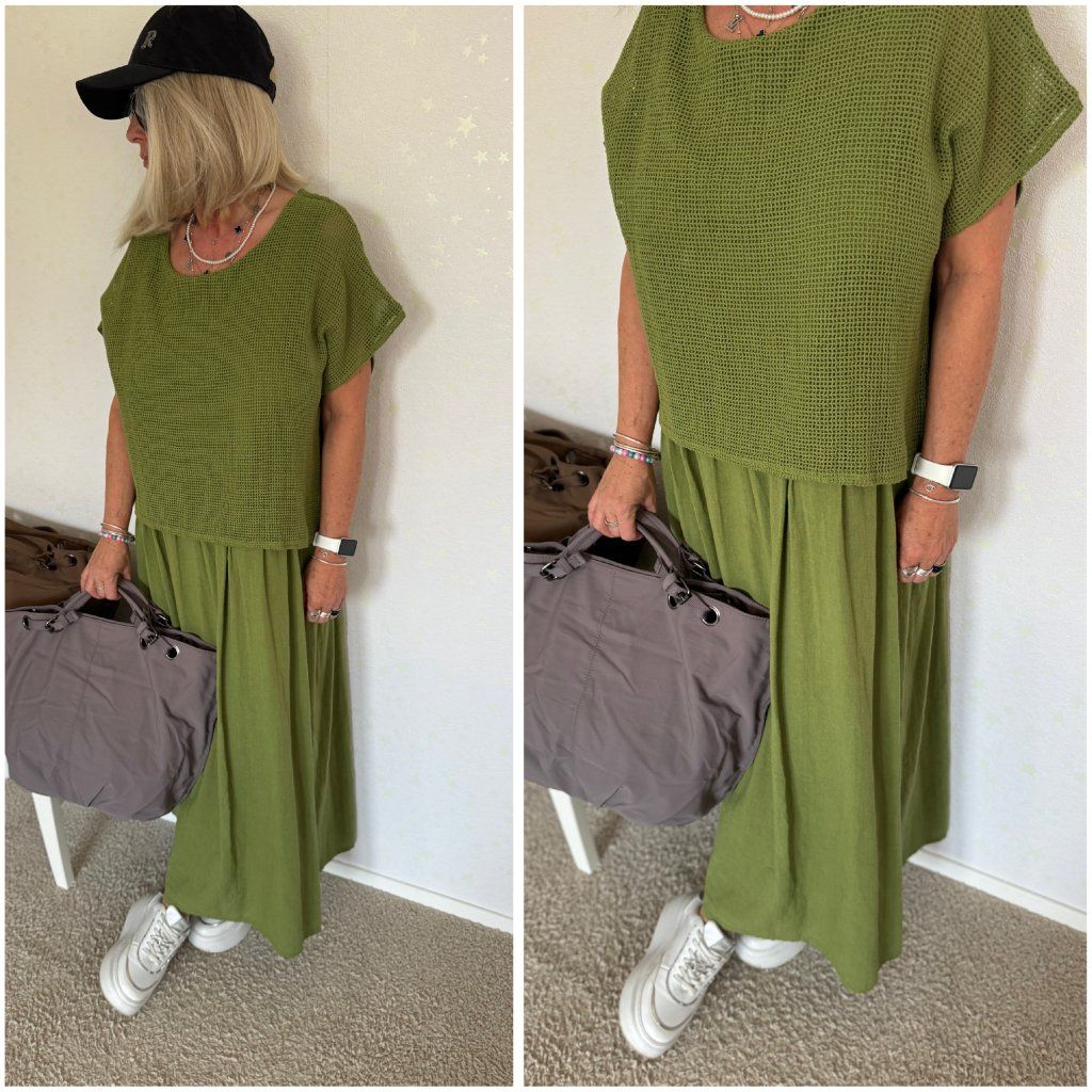 Prodyšný úpletový top s krátkým rukávem a volná lněná sukně s příjemným splývavým střihem.