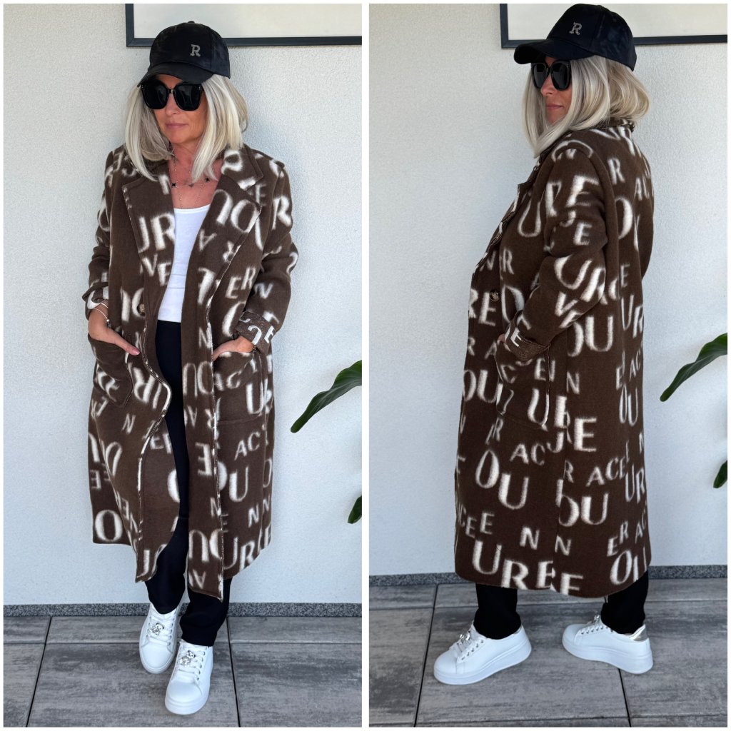 Oživte svůj šatník nepřehlédnutelným kabátem s moderním písmenkovým potiskem! Tento dlouhý kabát je perfektní volbou pro chladnější dny. Měkký, hřejivý materiál a pohodlný volnější střih vám zajistí pohodlí během celého dne, zatímco trendy design upoutá pozornost na první pohled.