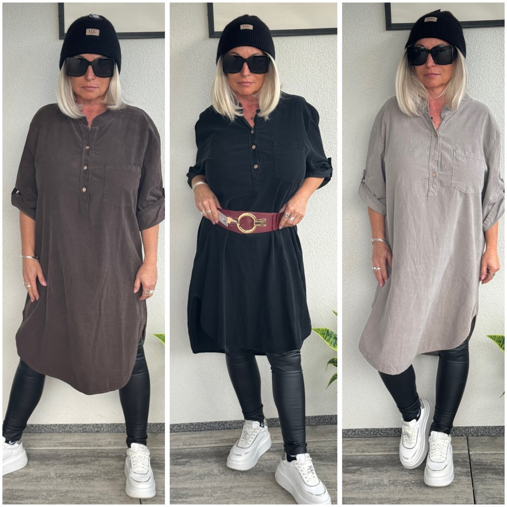 Vytvořte si moderní podzimní outfit – oblékněte manšestrové šaty s legínami a doplňte je stylovým páskem nebo čepicí.