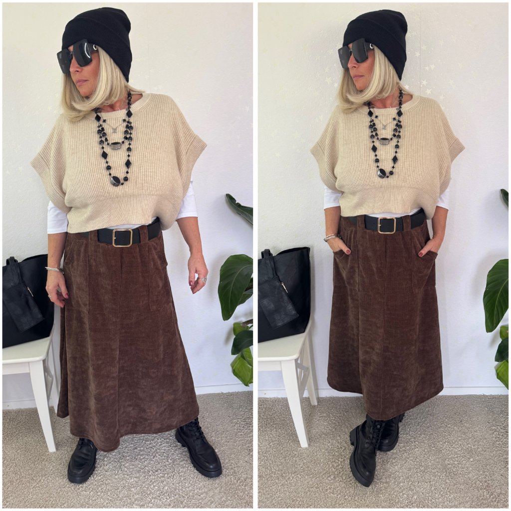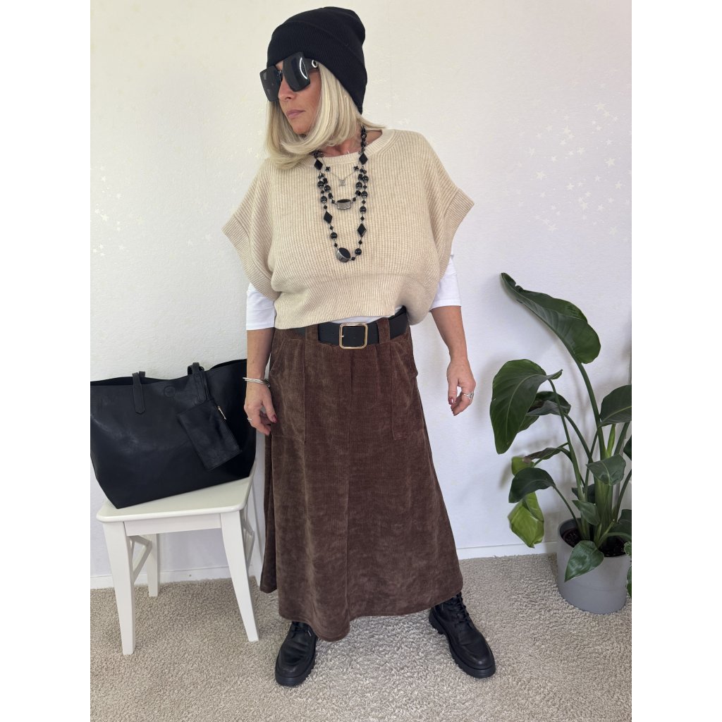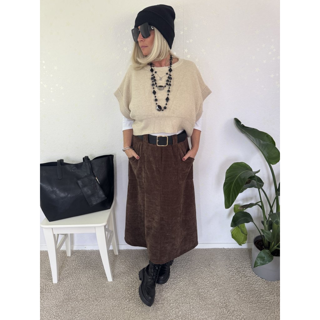 Stylová sukně z měkkého manšestru v hnědé barvě je skvělá volba pro podzimní i zimní outfity.
