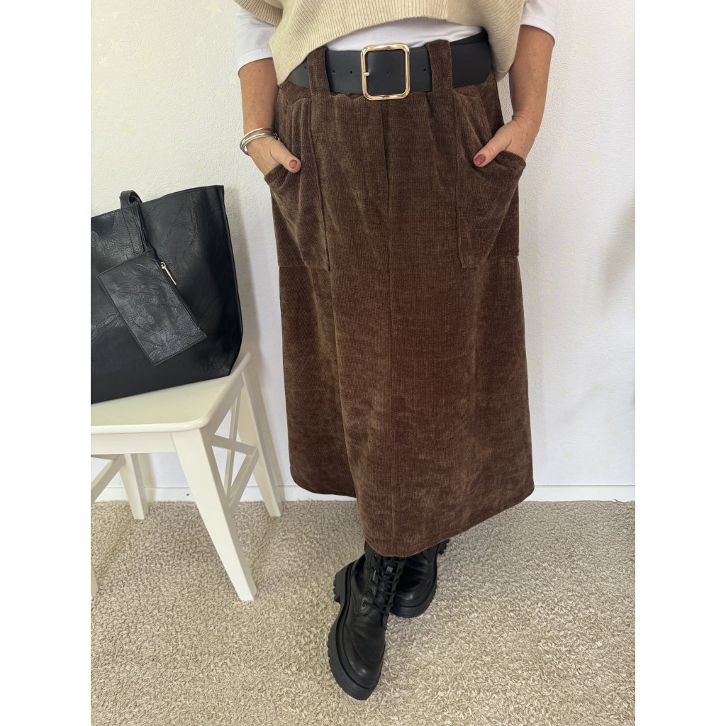 Delší sukně jemný manžestr HNĚDÁ s páskem