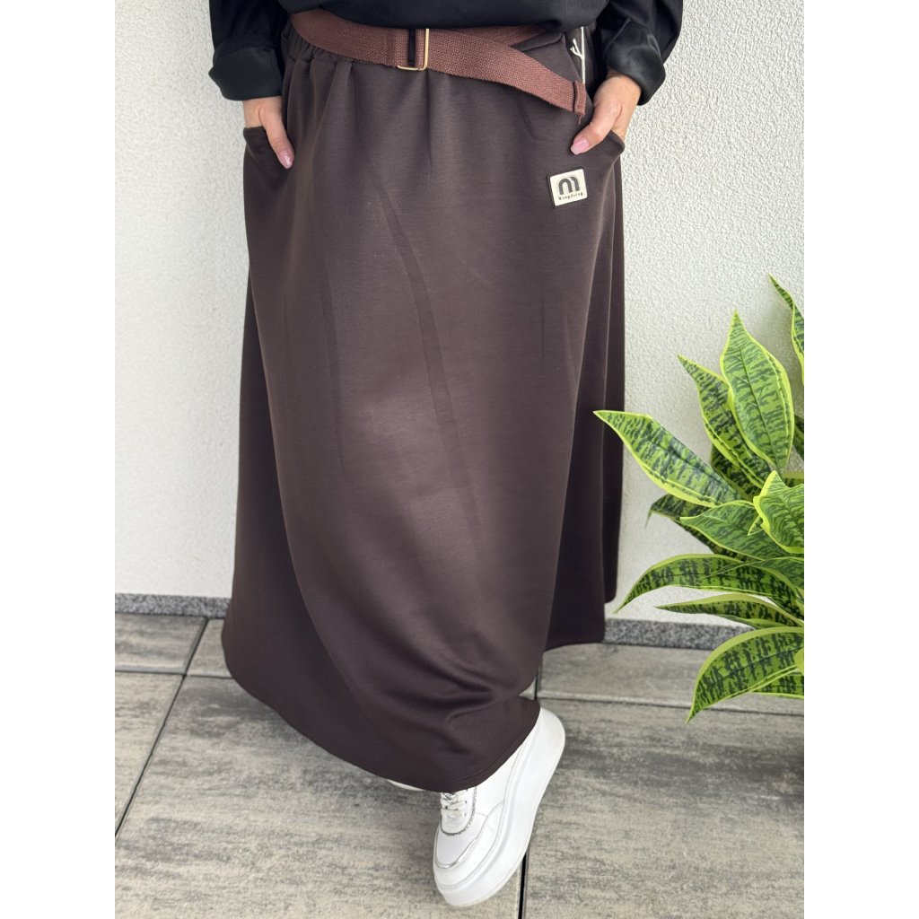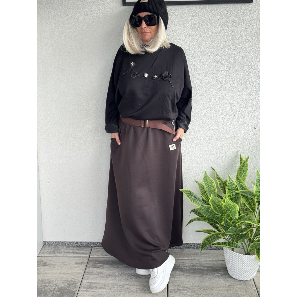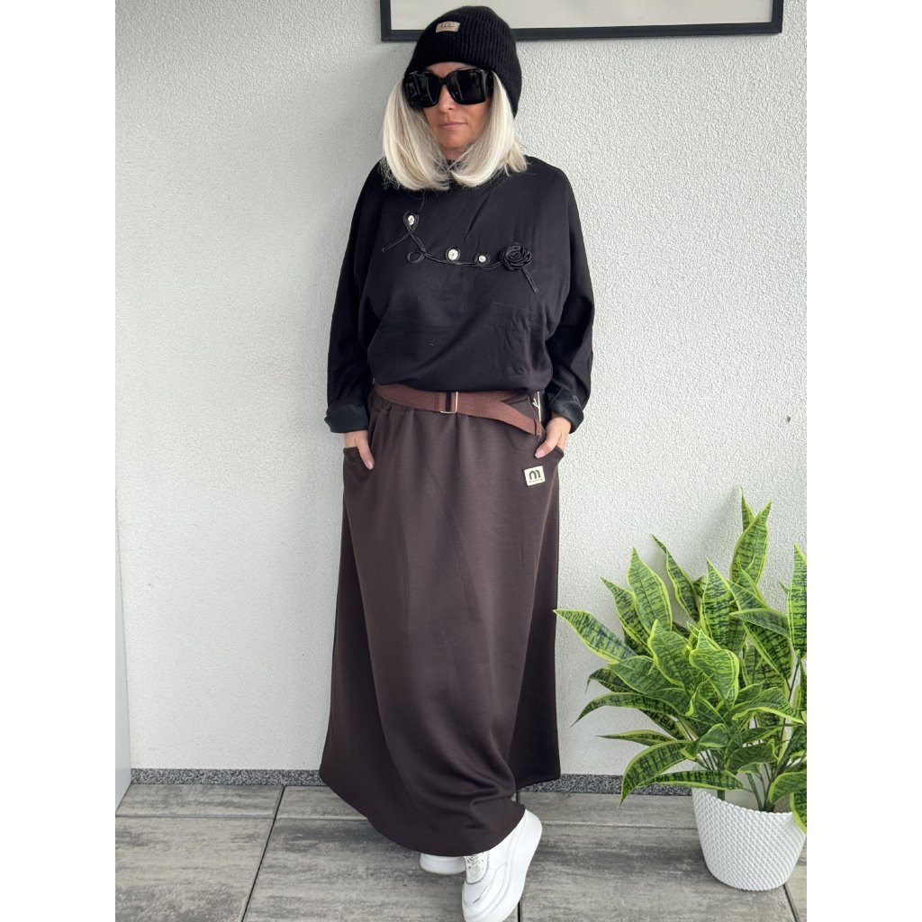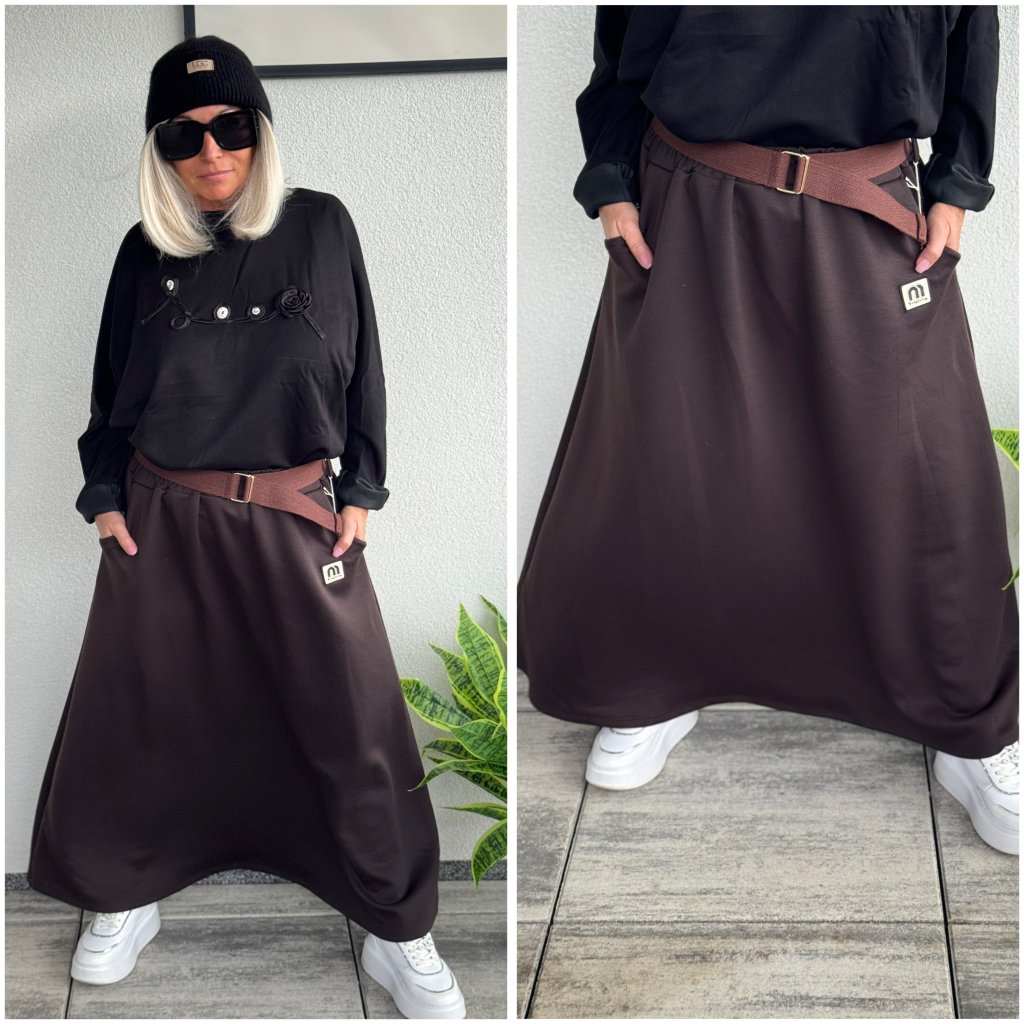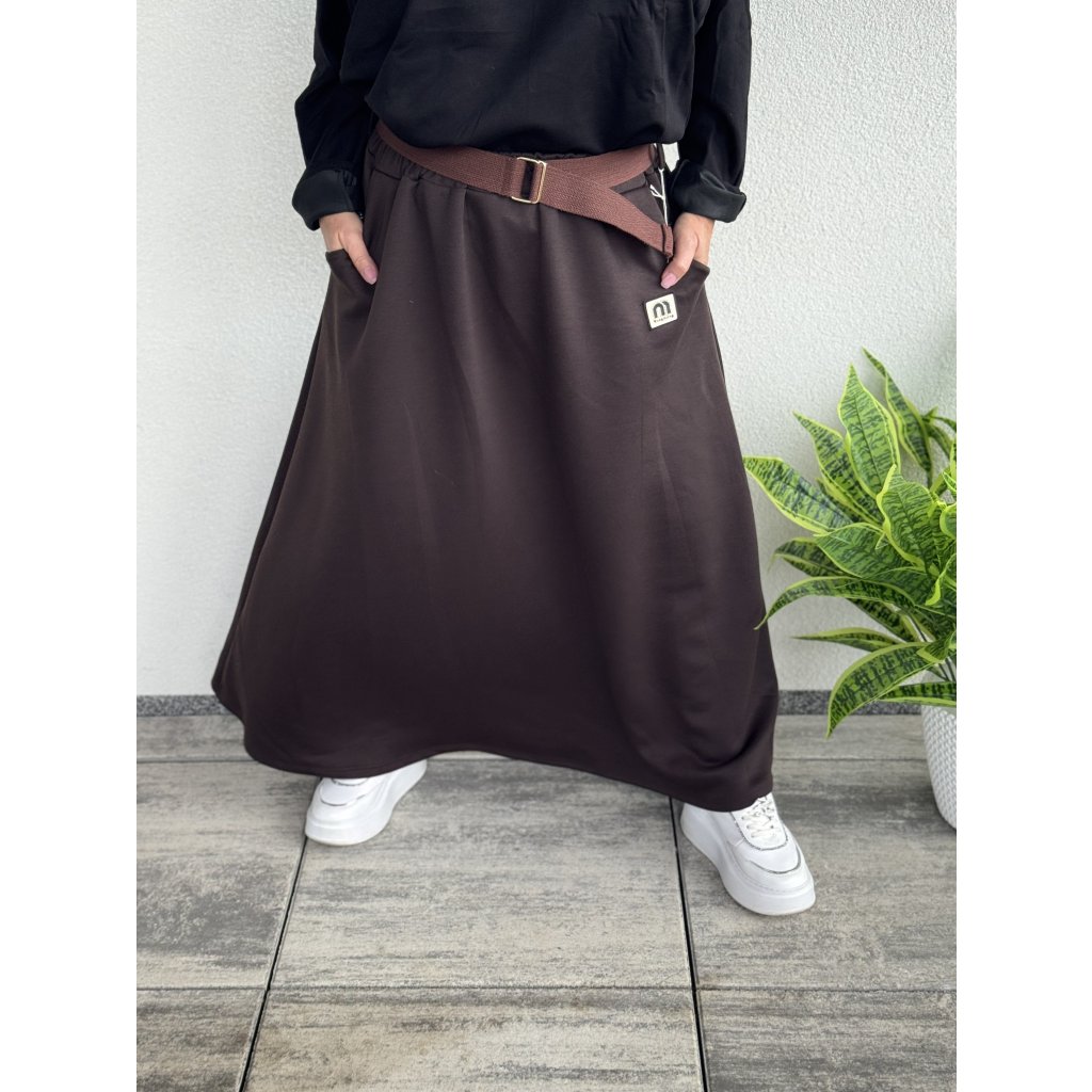Tato širší sukně s efektním střihem a pohodlným pasem je ideální volbou na podzimní dny – zahřeje, vypadá skvěle a hodí se ke každému outfitu.