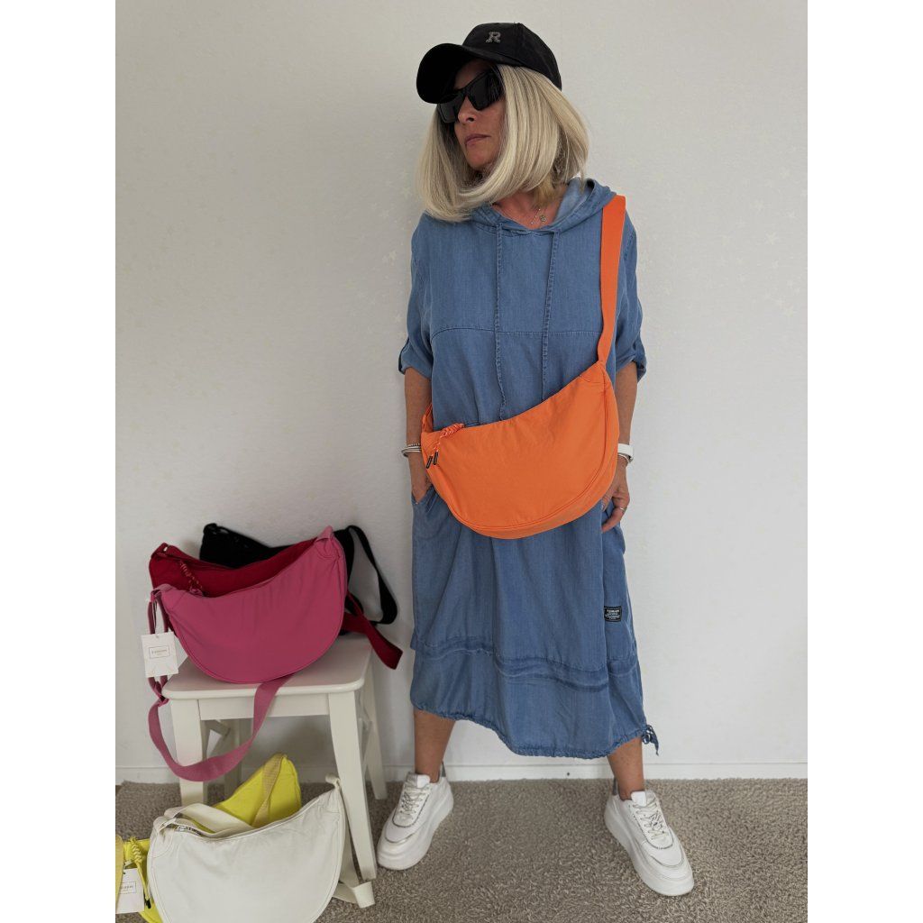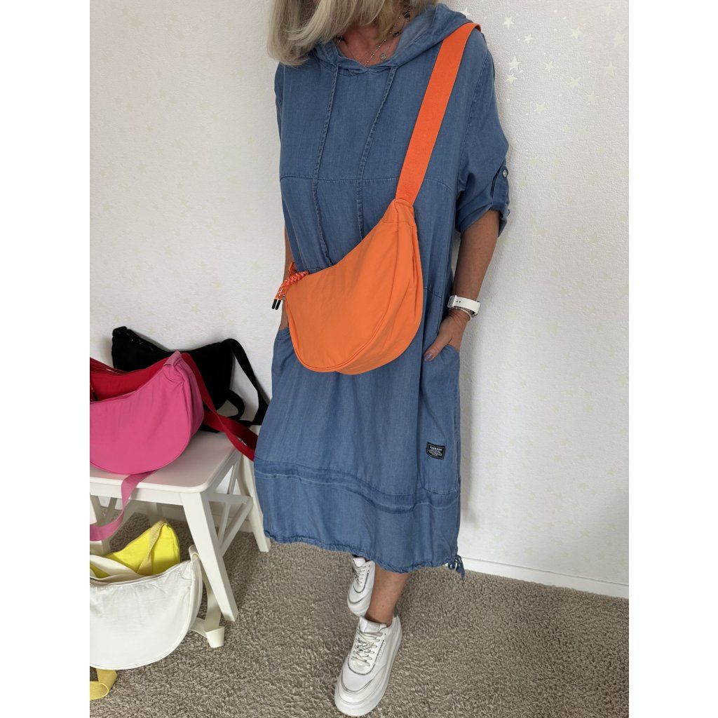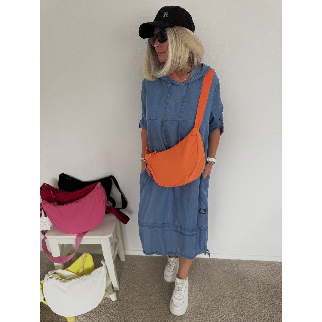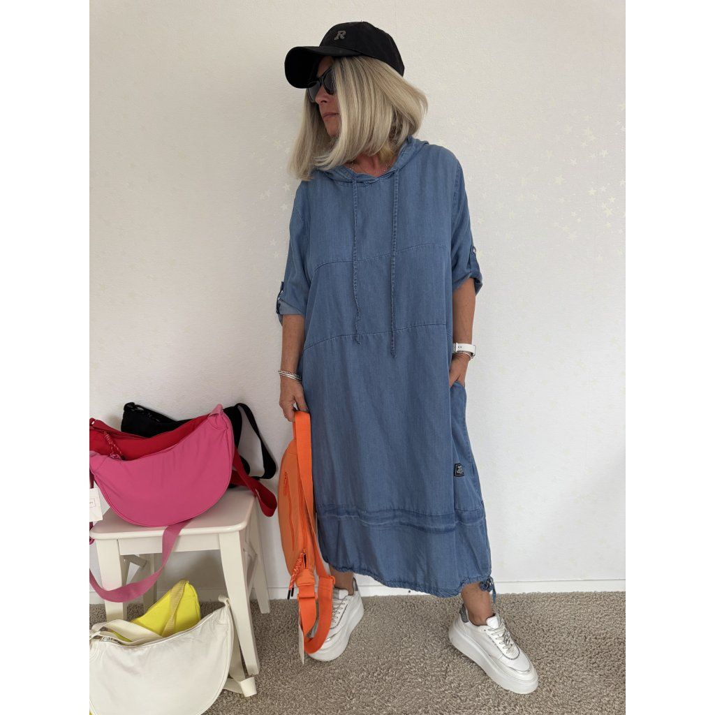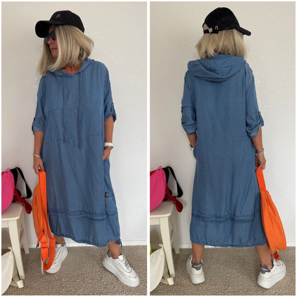 Volný střih s kapucí, praktickými kapsami a surovým lemem dodává šatům moderní oversized look.