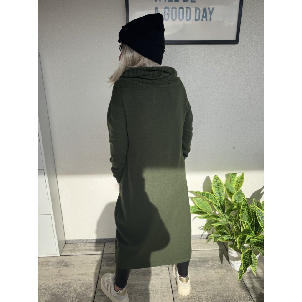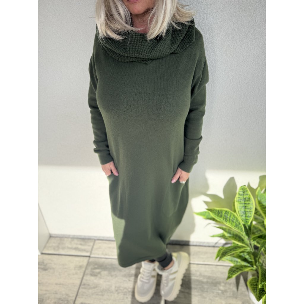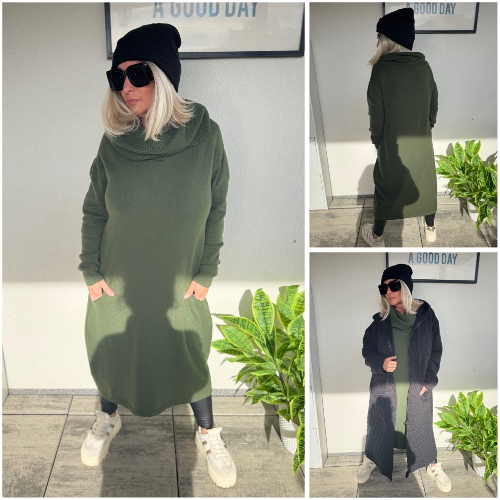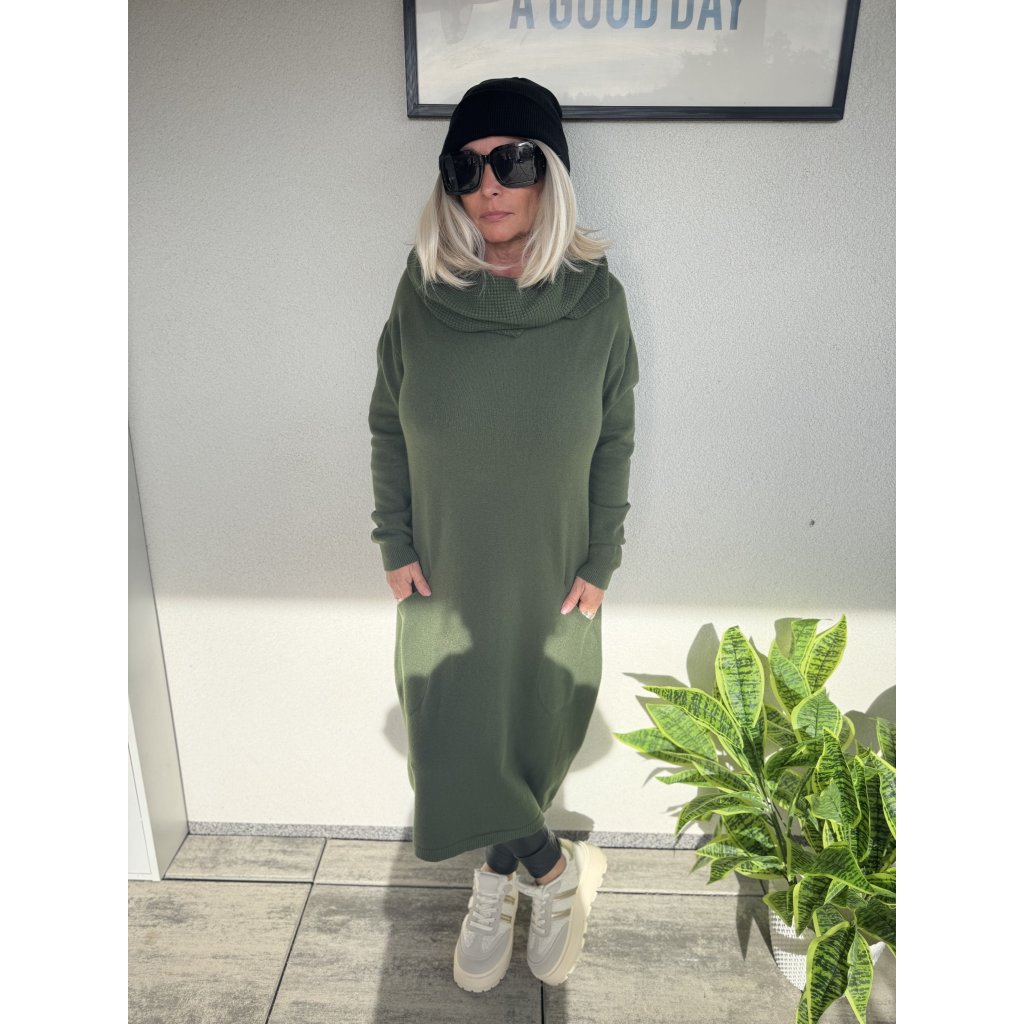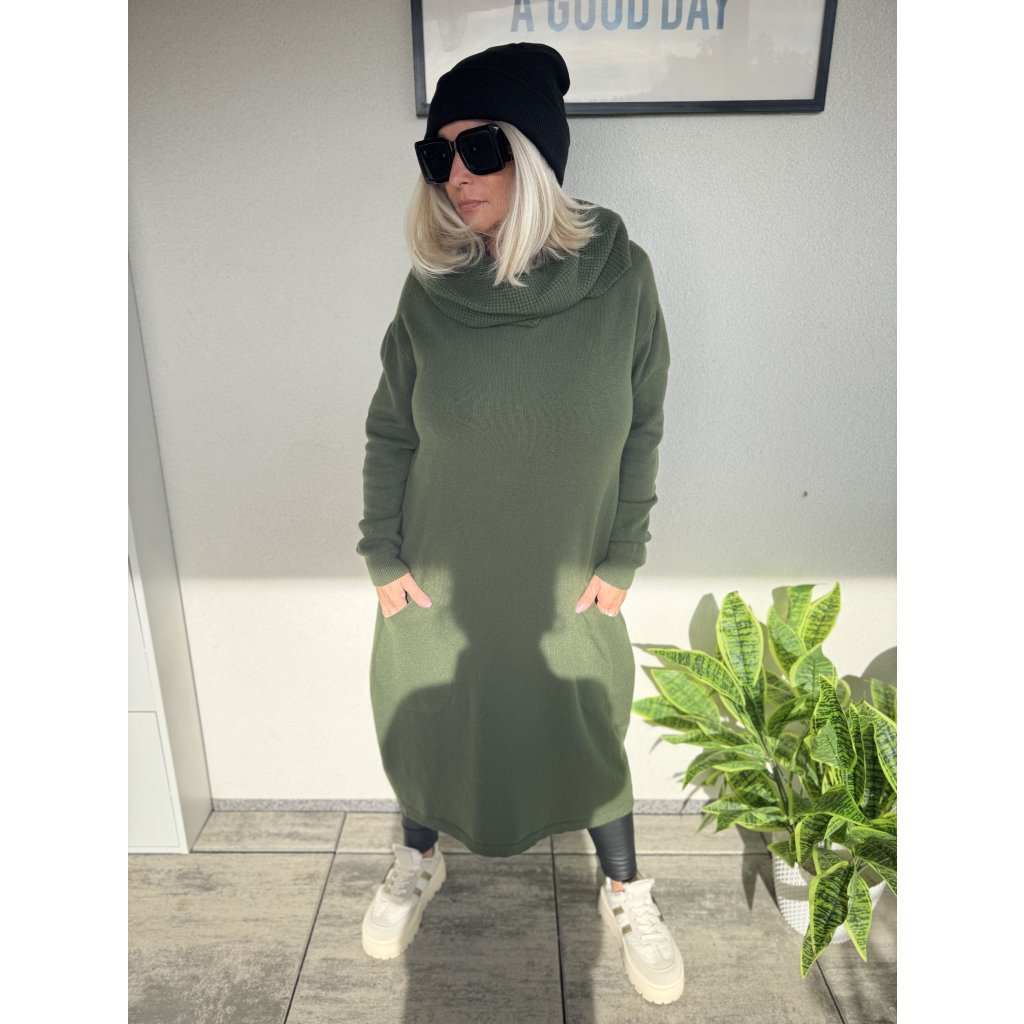 Tyto dlouhé rolákové šaty kombinují měkký materiál, moderní jednoduchý střih a praktické kapsy.