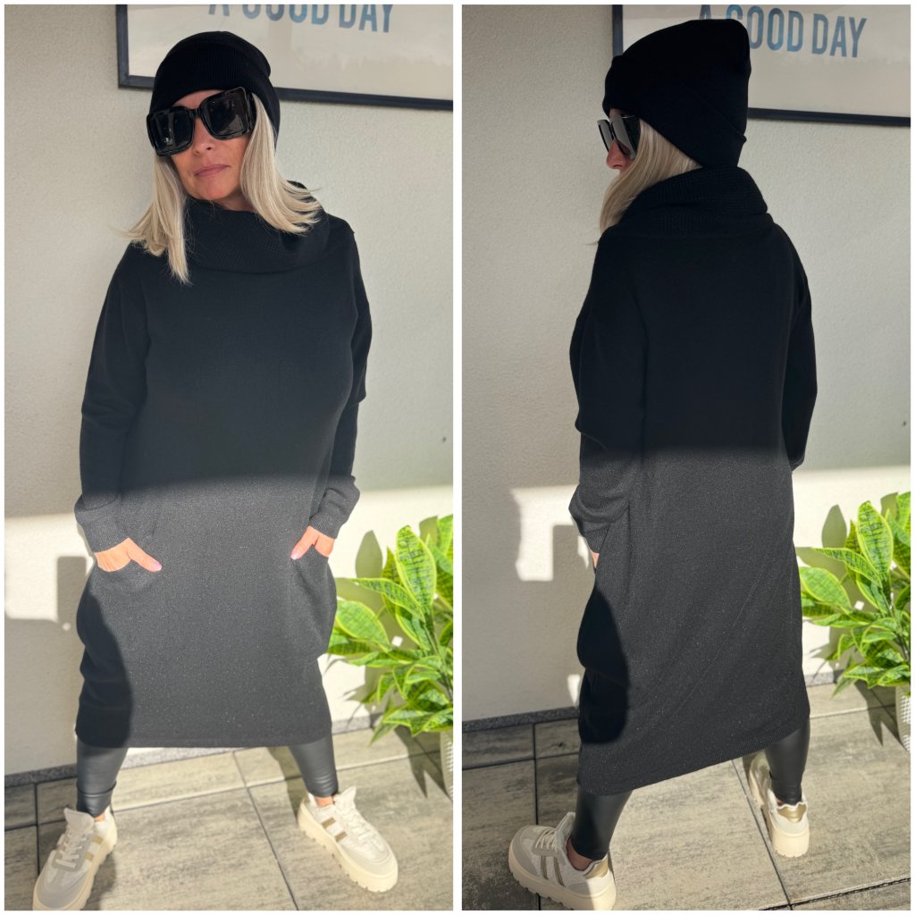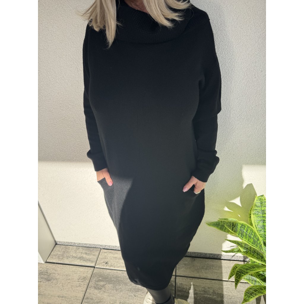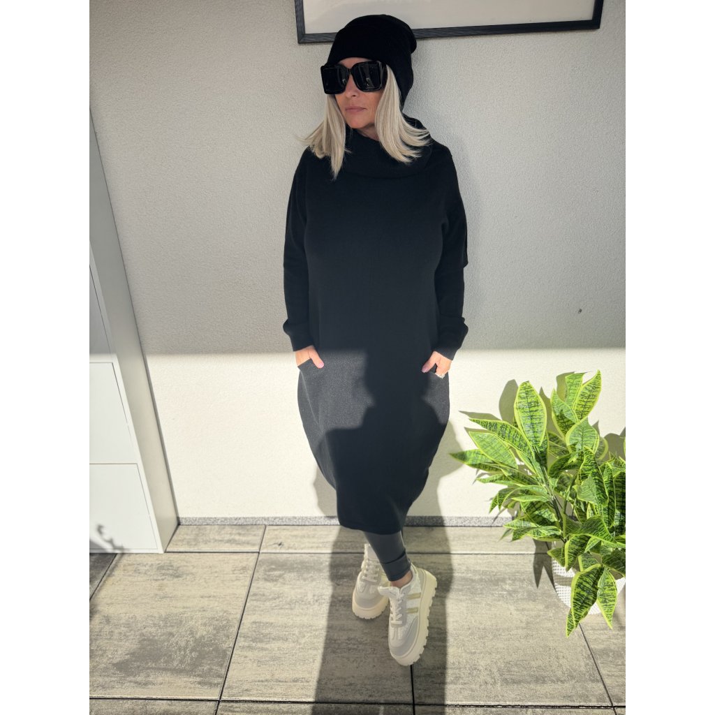 Tyto dlouhé rolákové šaty kombinují měkký materiál, moderní jednoduchý střih a praktické kapsy.