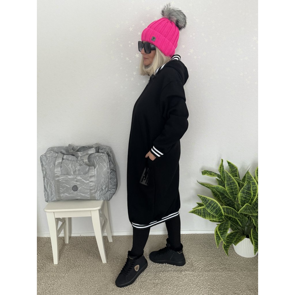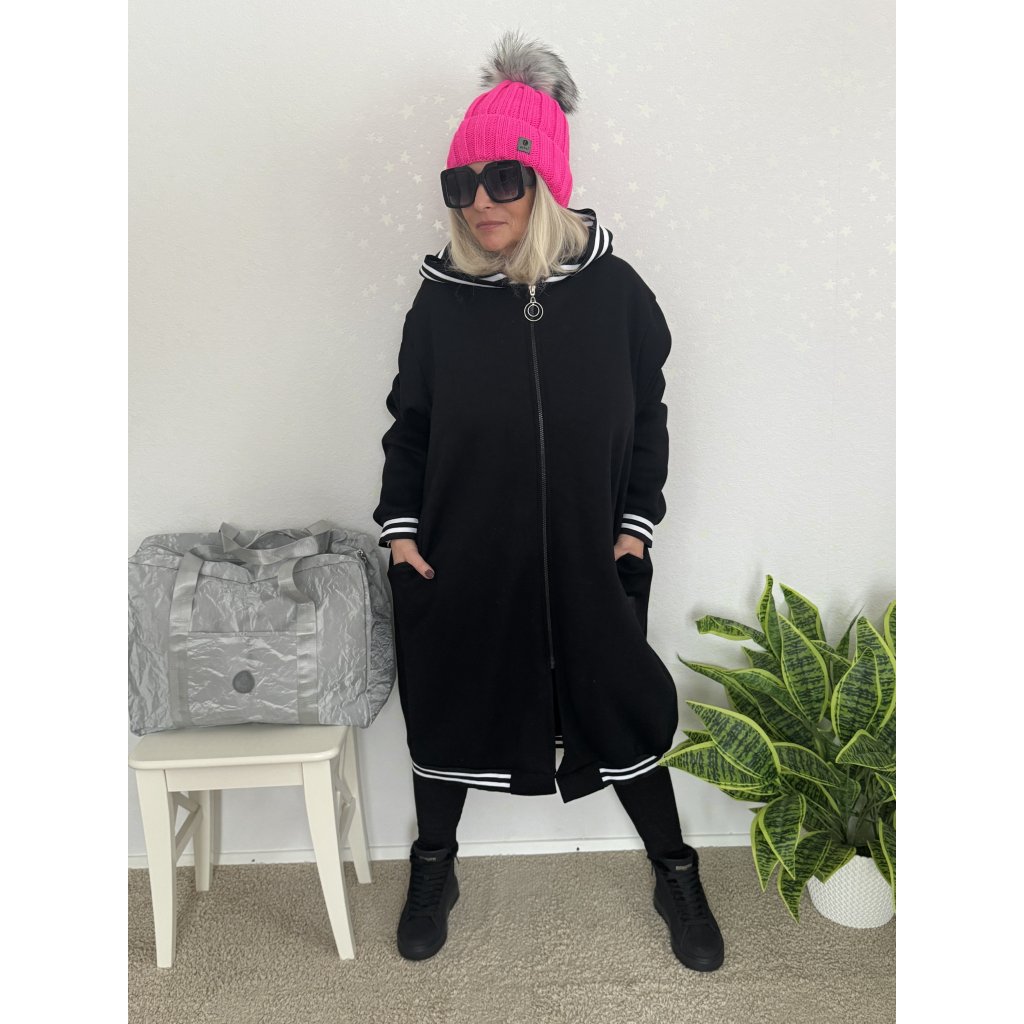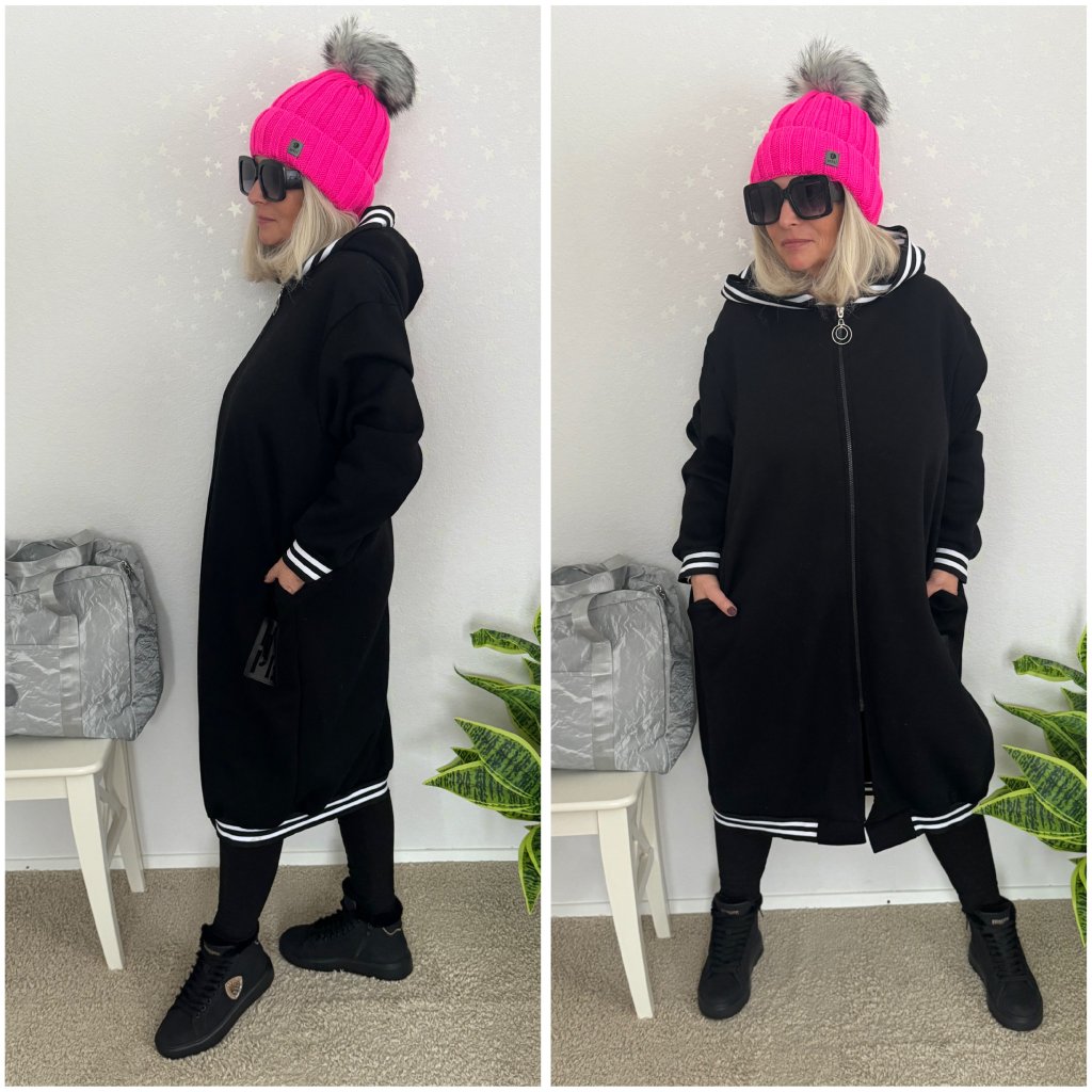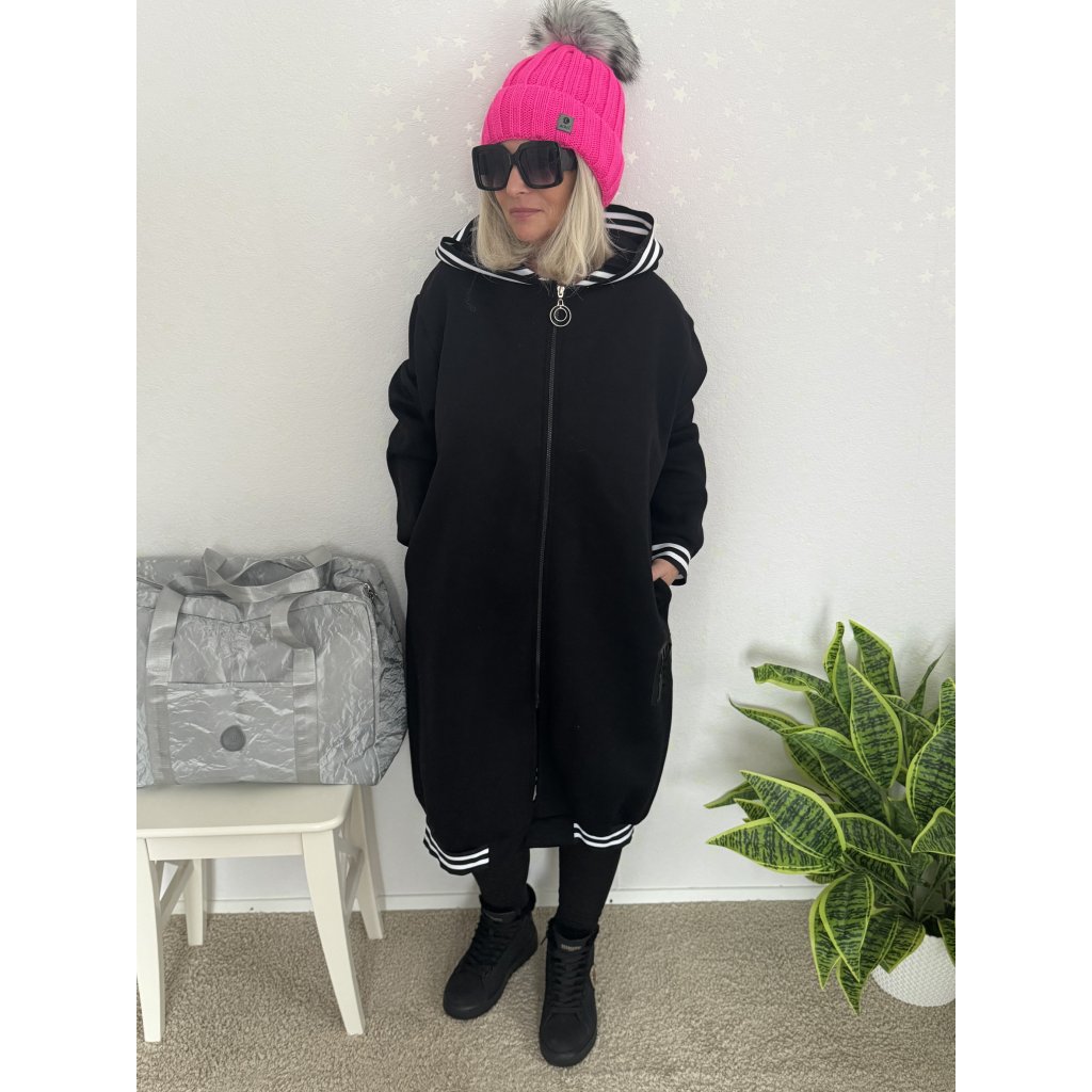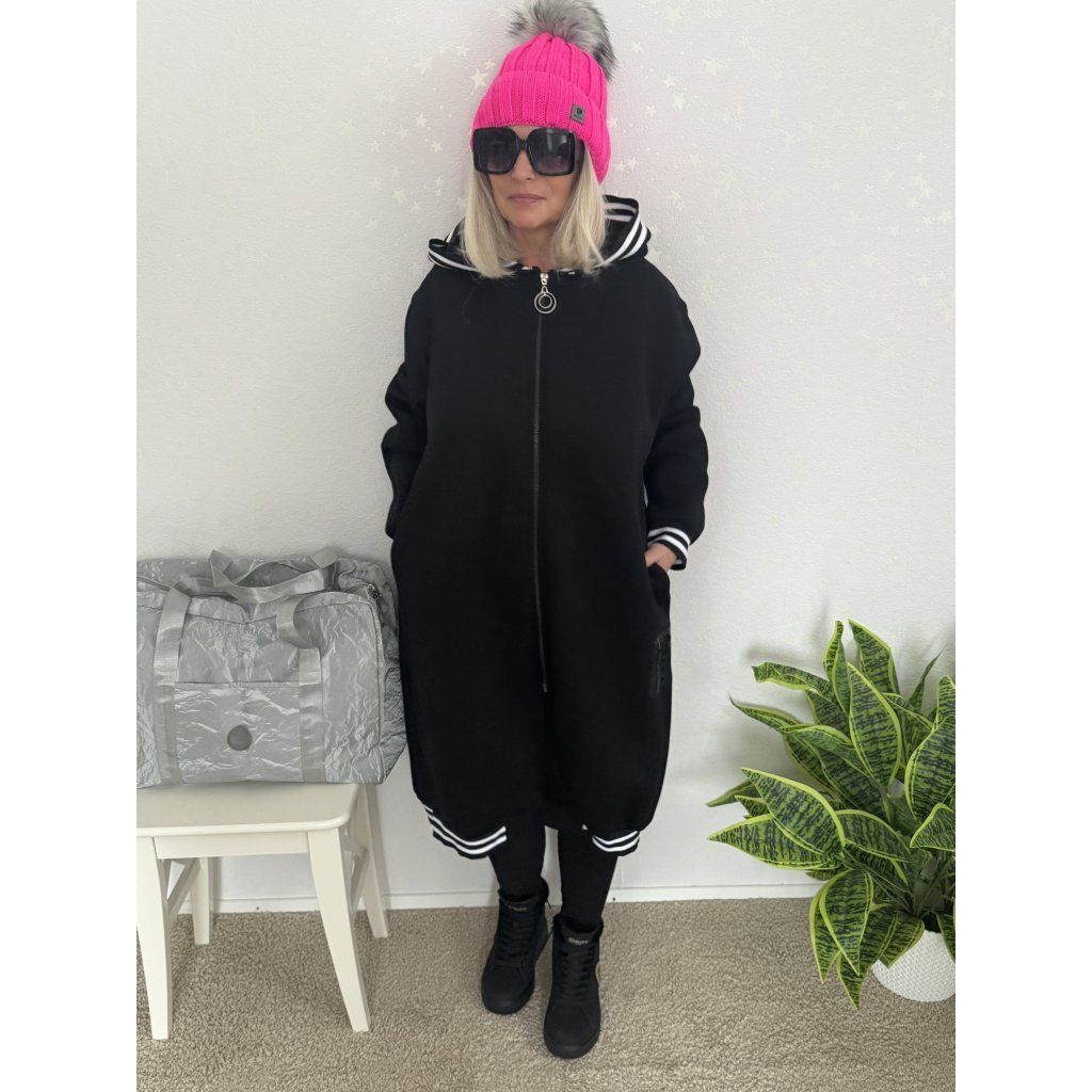 Stylová prodloužená mikina na zip s kapucí, kontrastními lemami a prostornými kapsami – prodloužený střih chrání záda, vysoký materiál s chlupatou podšívkou reguluje teplo.