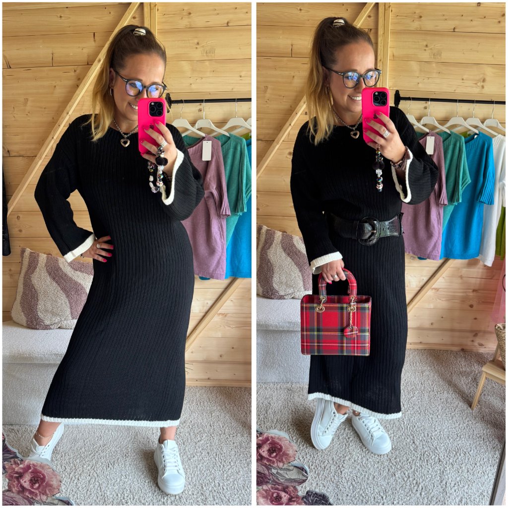 Elegantní černé provedení, příjemný měkký úplet a volnější střih lichotí každé postavě. Výrazné manžety a spodní lem v kontrastní barvě dodávají šatům originální šmrnc. Skvěle se hodí k teniskám pro ležérní look, ale snadno je doplníte i elegantními doplňky.