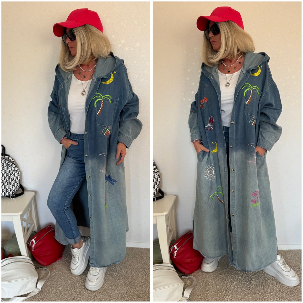Tento dlouhý oversized, volně padnoucí model s kapucí je ozdobený nádhernou ruční výšivkou – ručně vyšívané motivy.