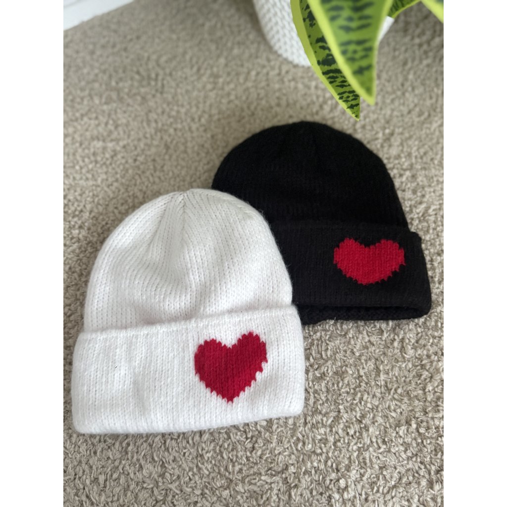 Trendy pletené čepice s výrazným červeným srdíčkem v černé i bílé variantě jsou dokonalým doplňkem.