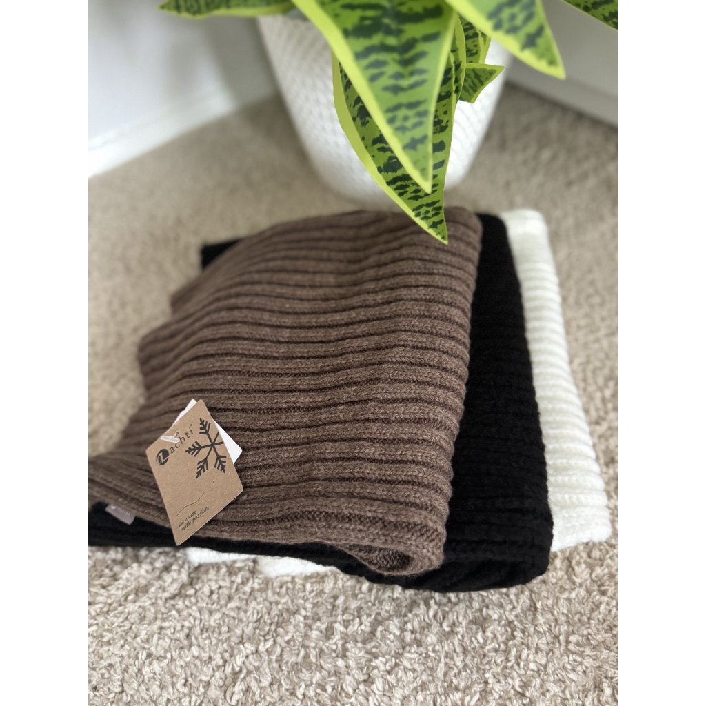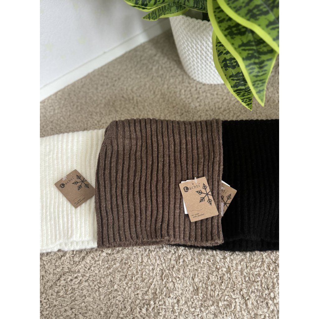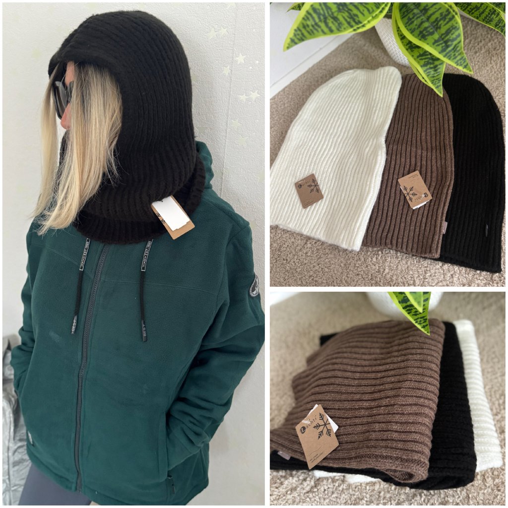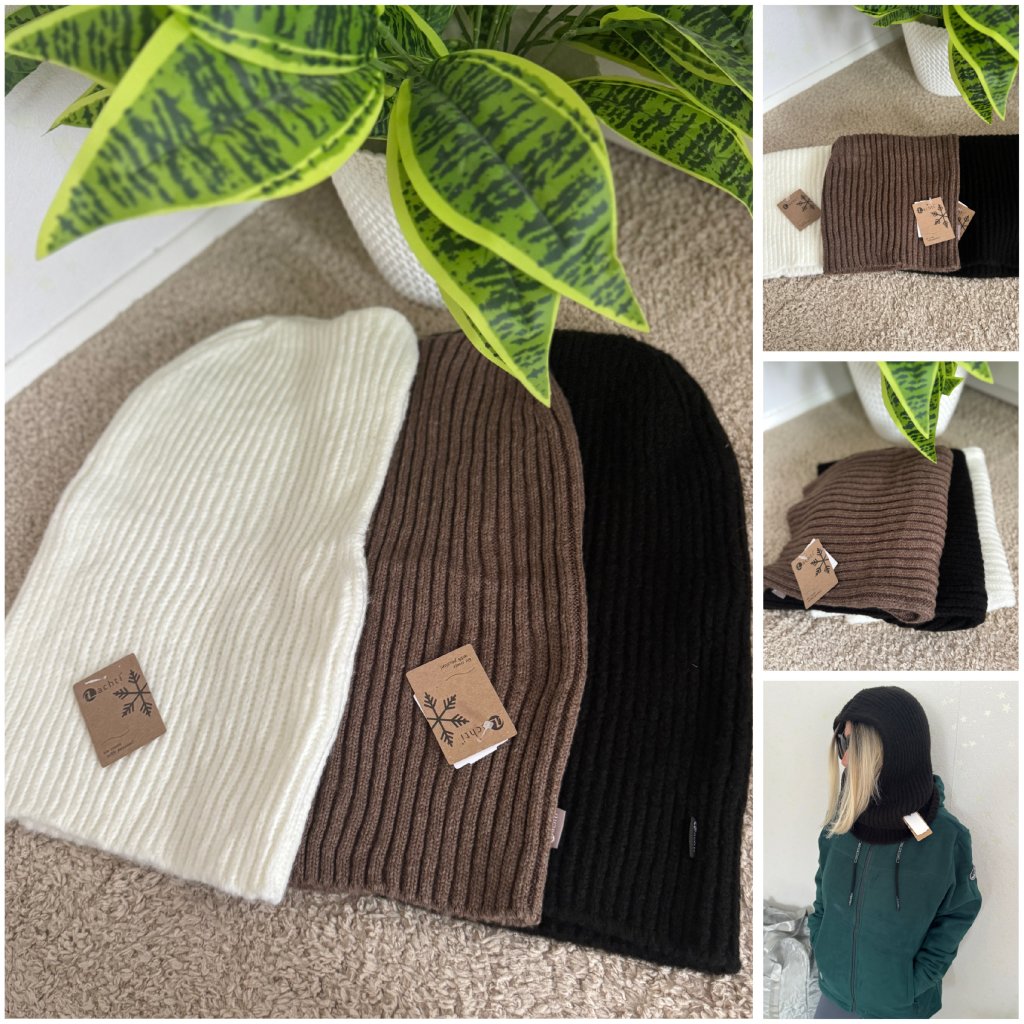 Teplé pletené kukly v černé, bílé a hnědé barvě s etiketou jsou stylovým doplňkem proti chladu, perfektně hřejícím krk a hlava.
