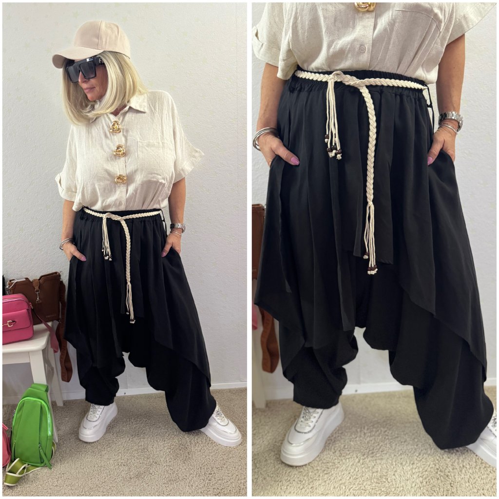 Extra pohodlné, volné kalhoty v stylu harem s výrazným asymetrickým spodním lemem – delší vzadu, kratší vpředu pro ten správný dramatický pohyb. Lehká, splývavá látka, guma v pase s unikátním pleteným lanovým páskem.