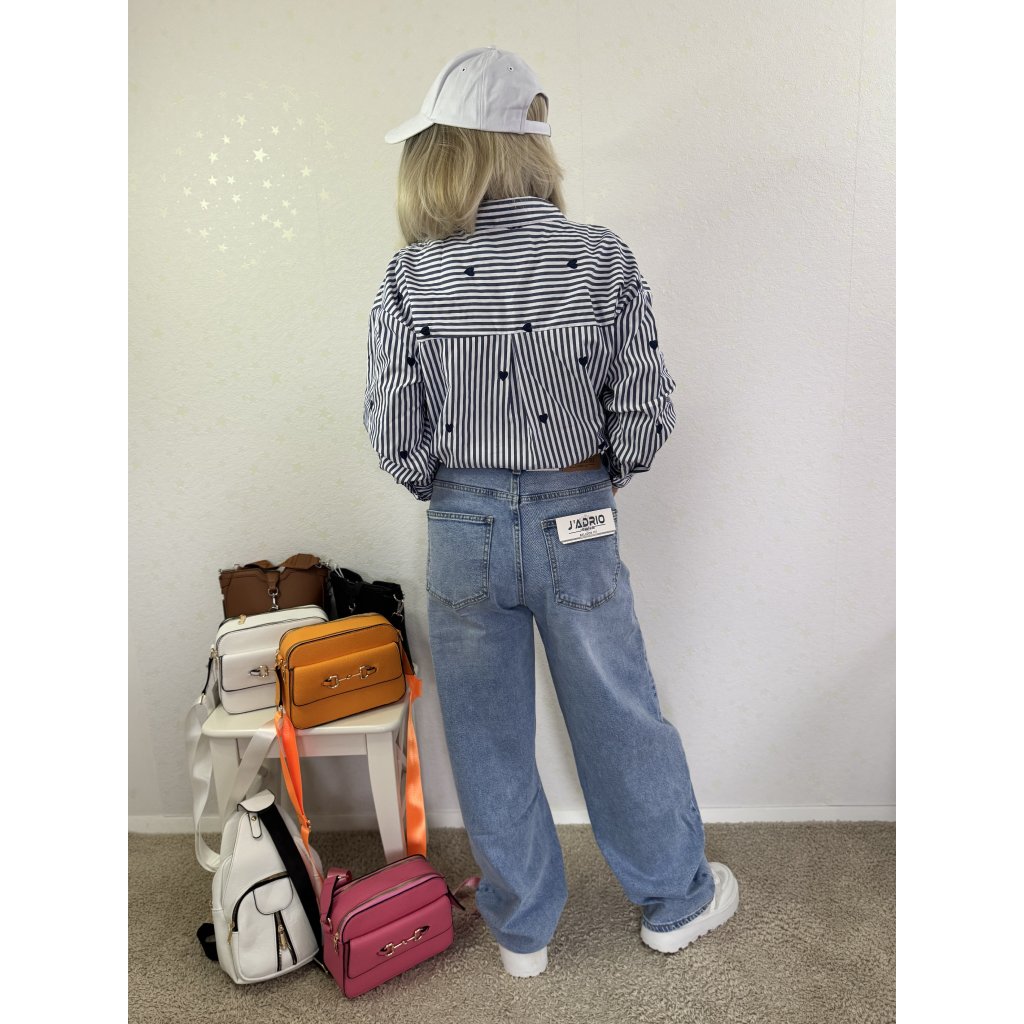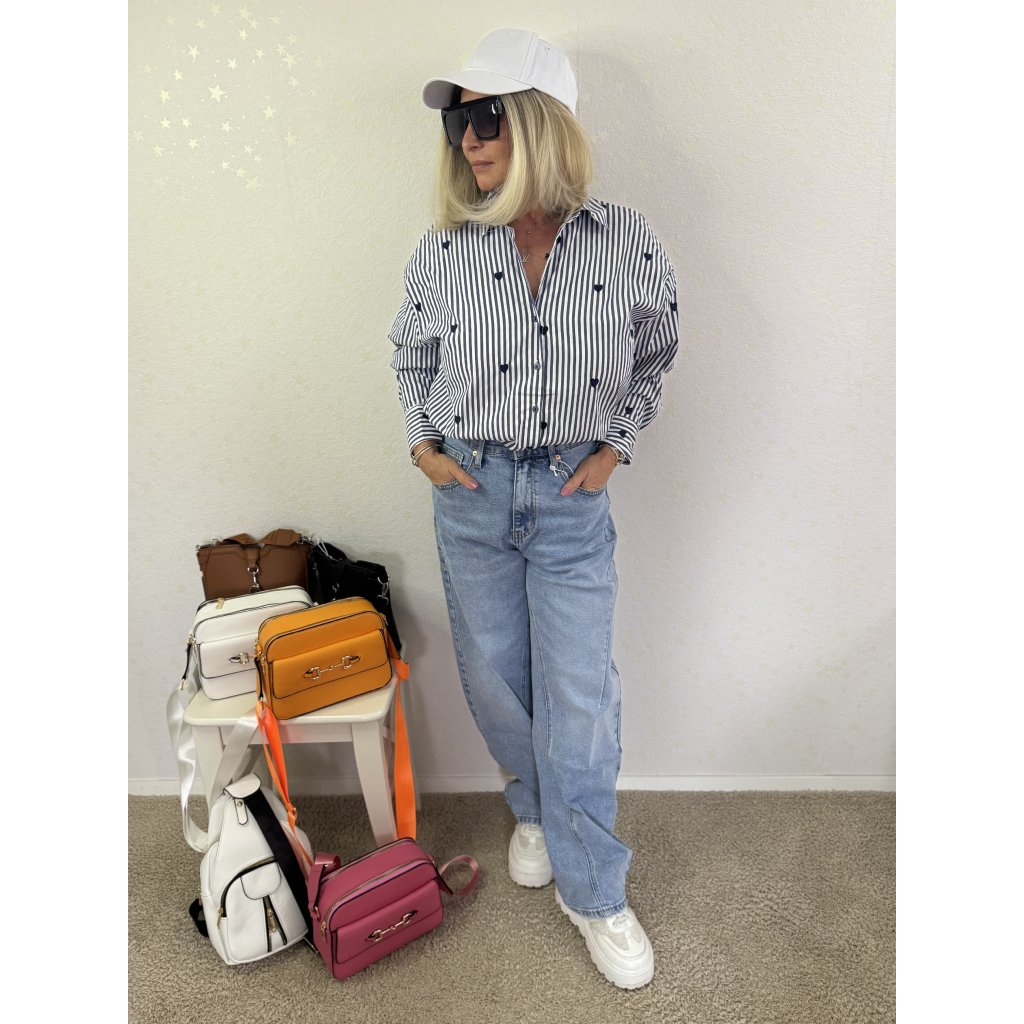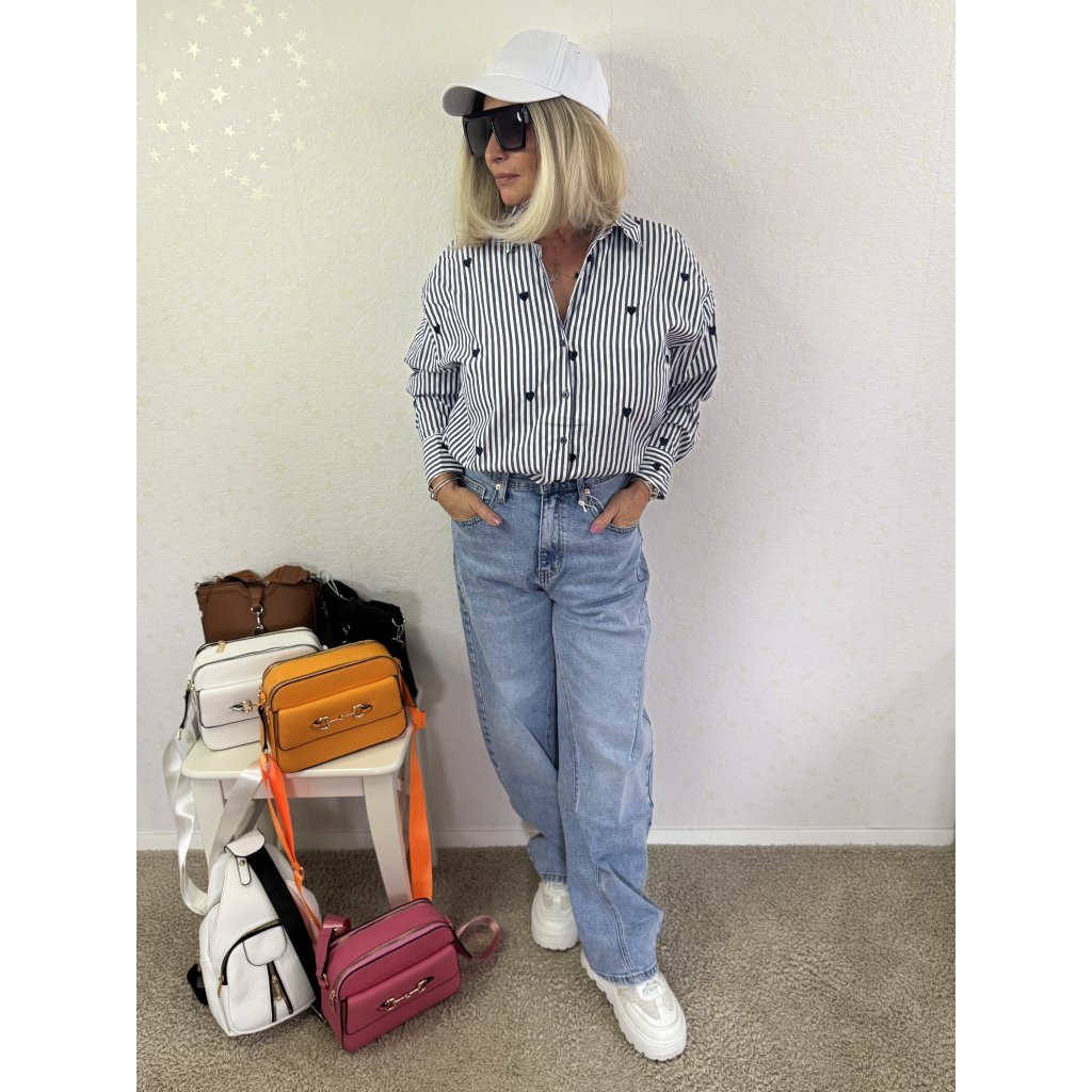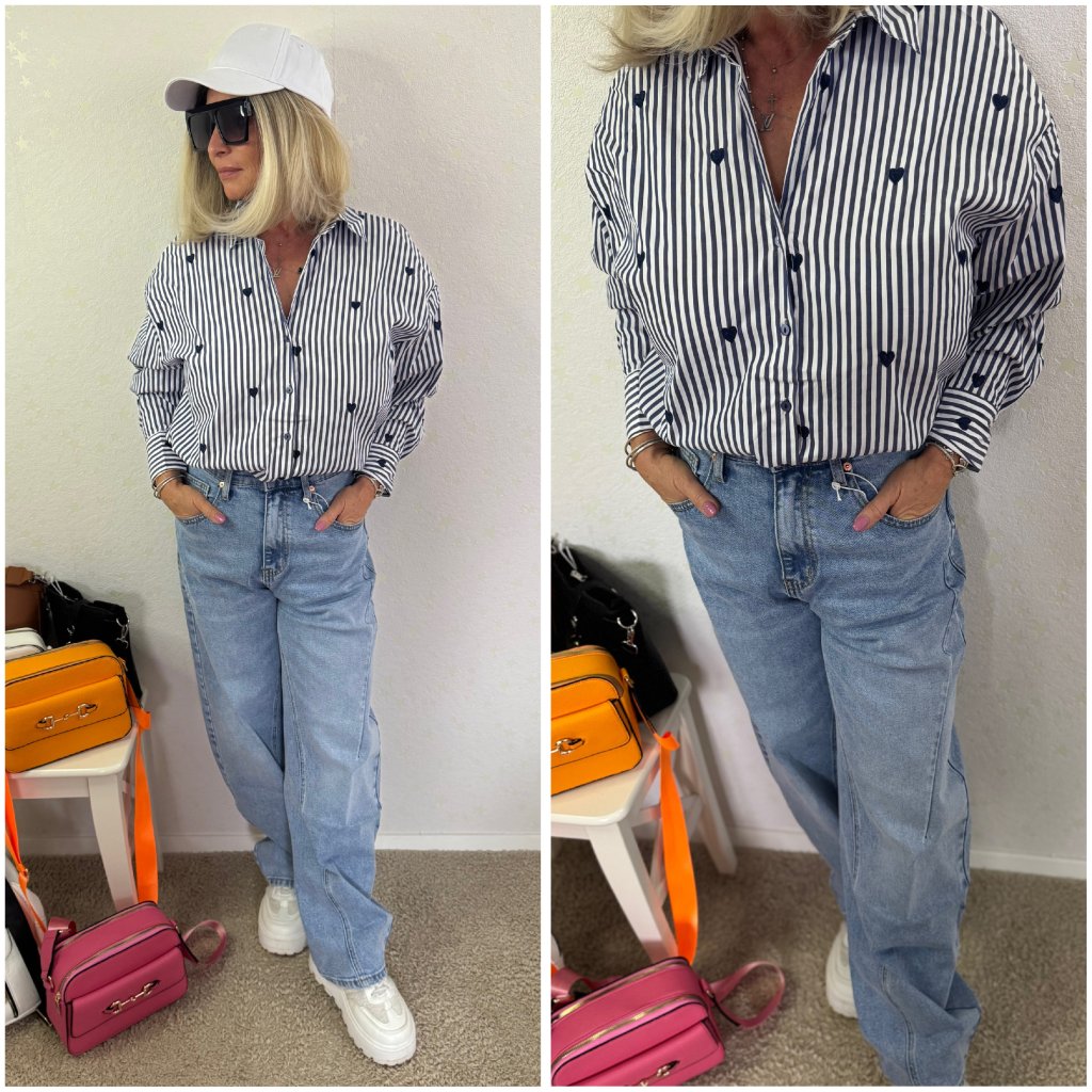 Romantická bavlněná oversize košile v modro-bílém pruhu s drobnými vyšitými srdíčky – tvůj nový oblíbenec plný sladké nálady!