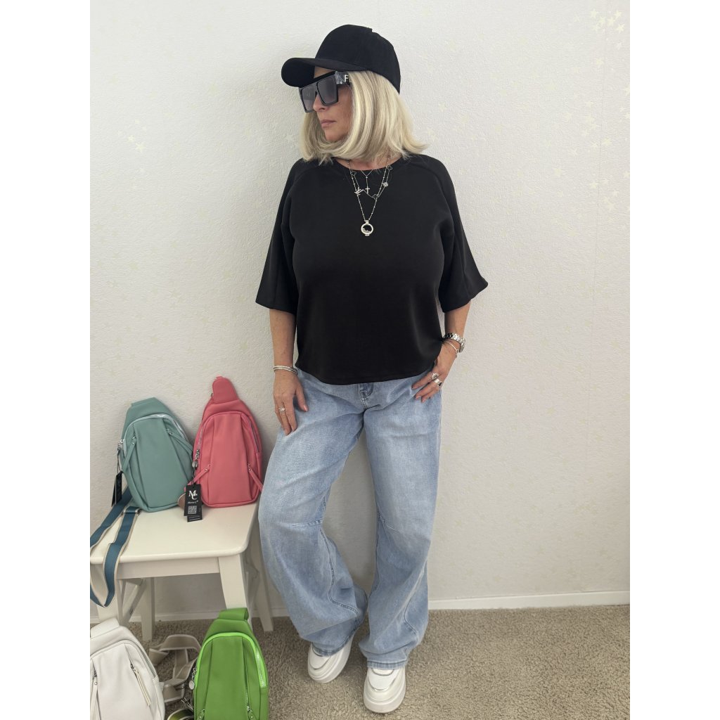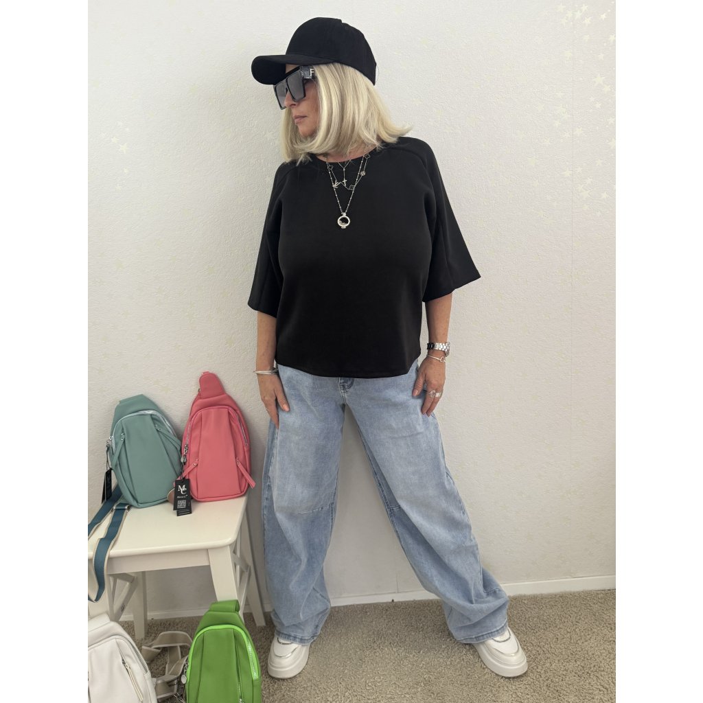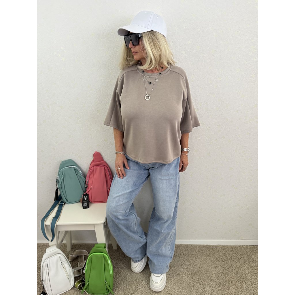 Volný oversize střih s krátkými balonovými rukávy (3/4 délka).