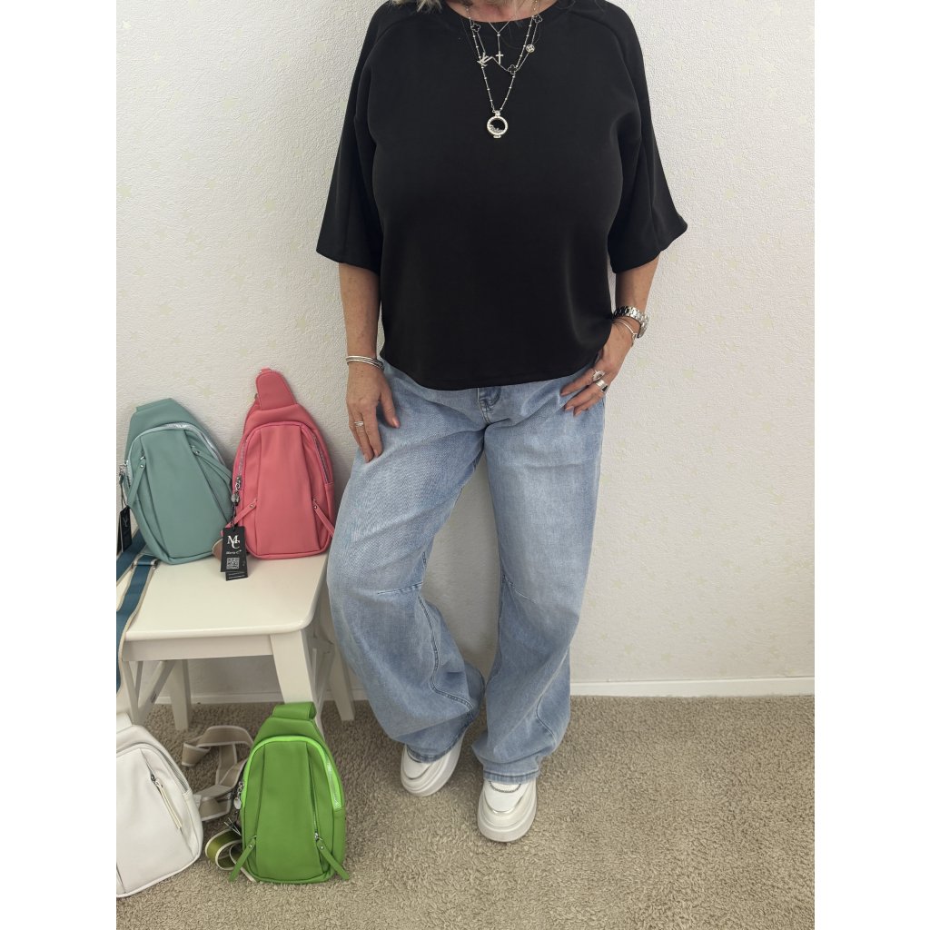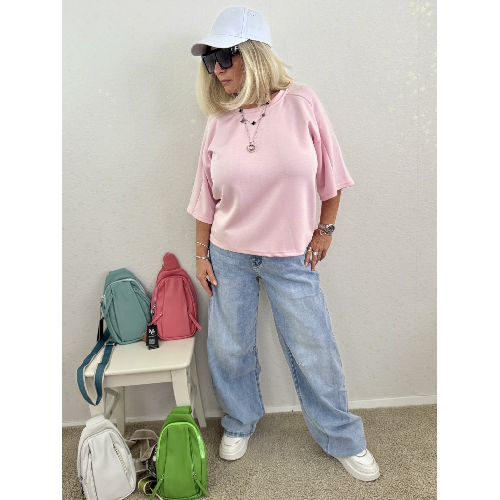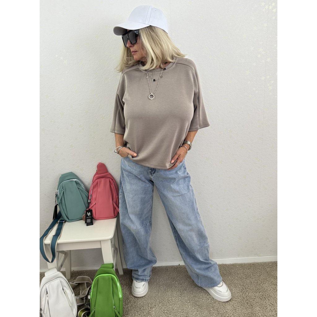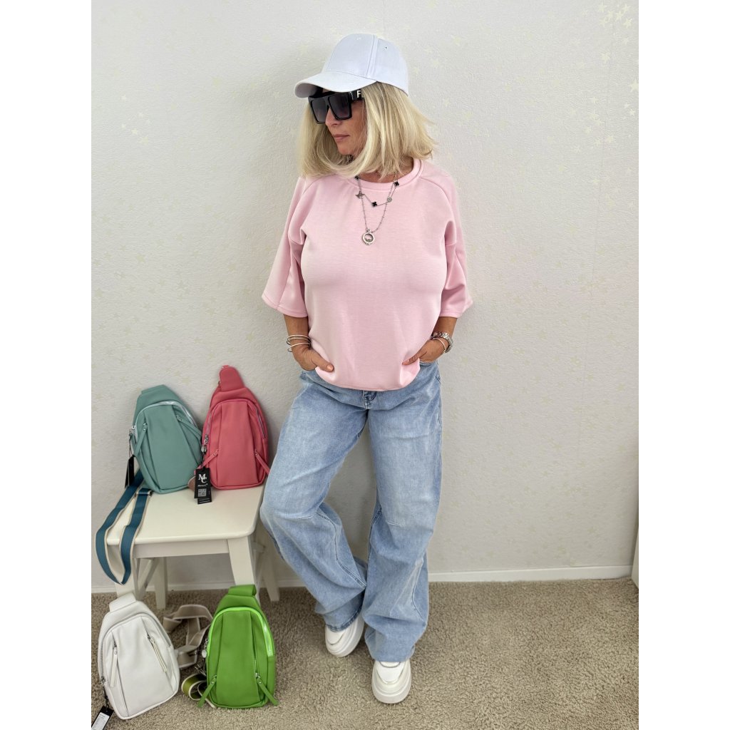 Volný oversize střih s krátkými balonovými rukávy (3/4 délka).