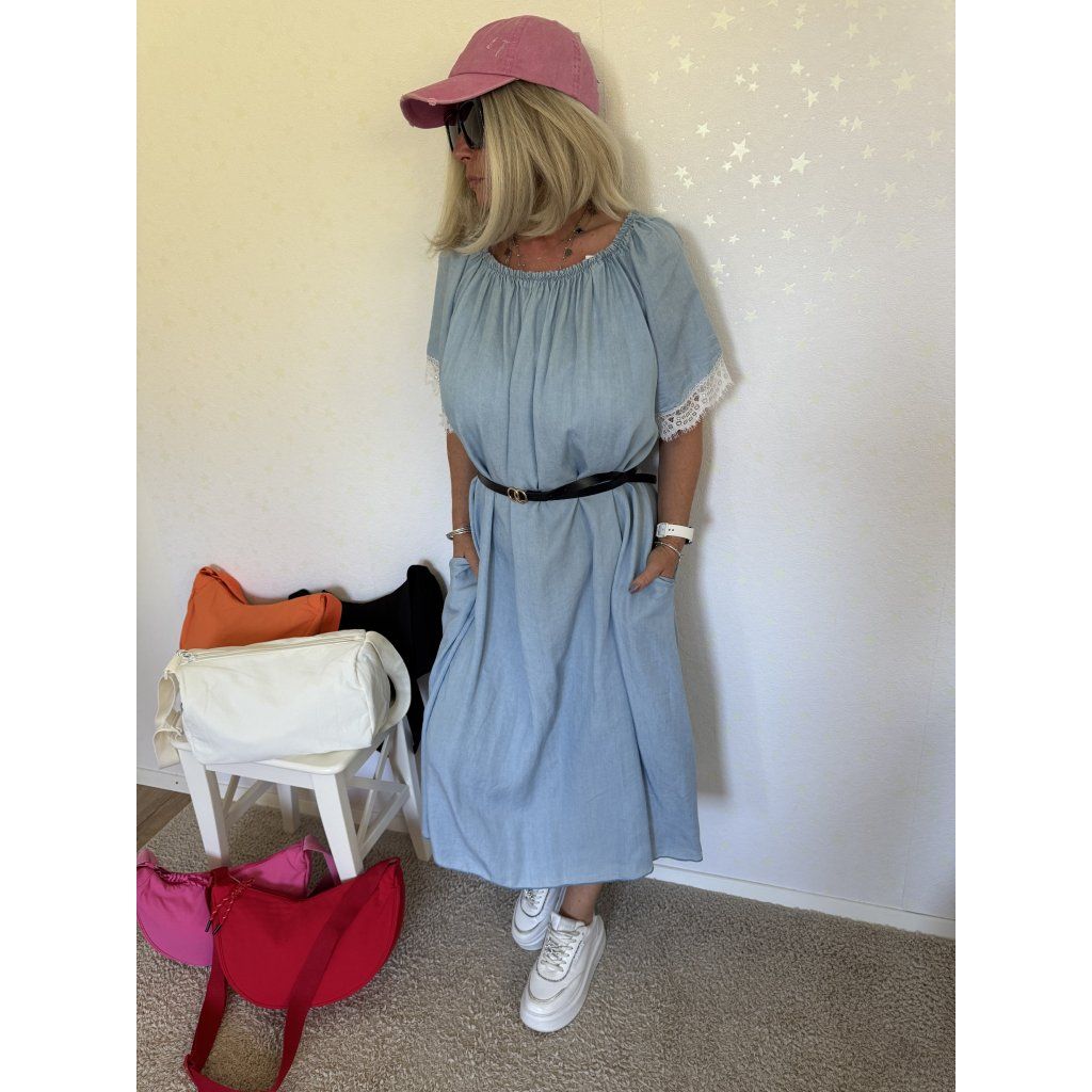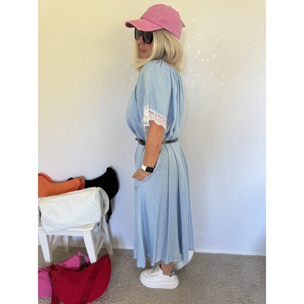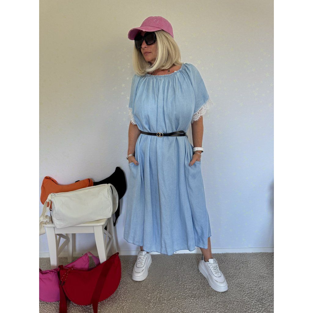 Volný střih a krásné krajkové detaily na rukávech dodává šatům moderní oversized look.