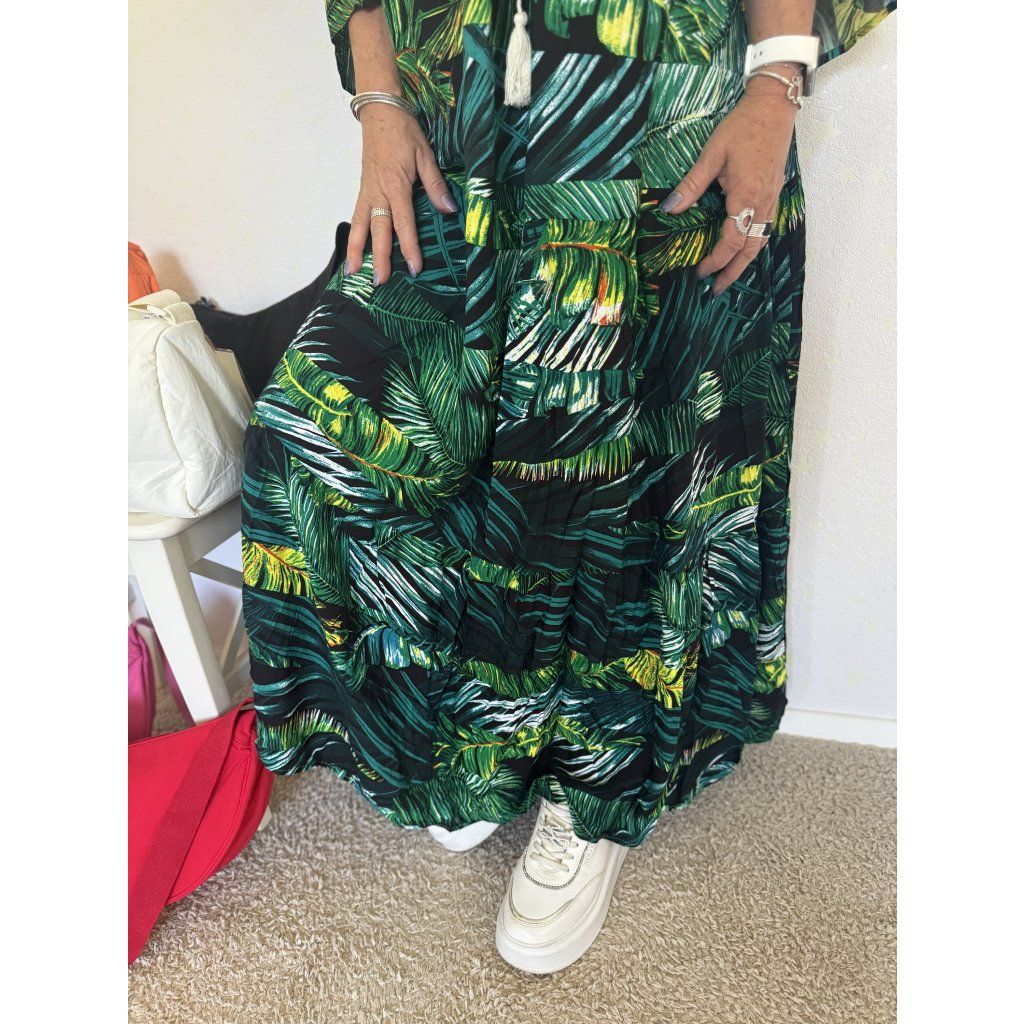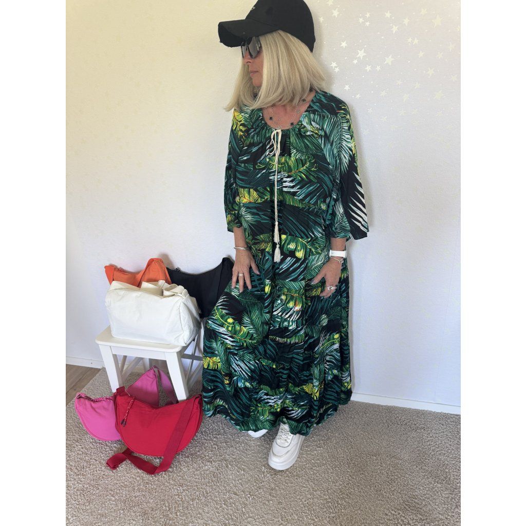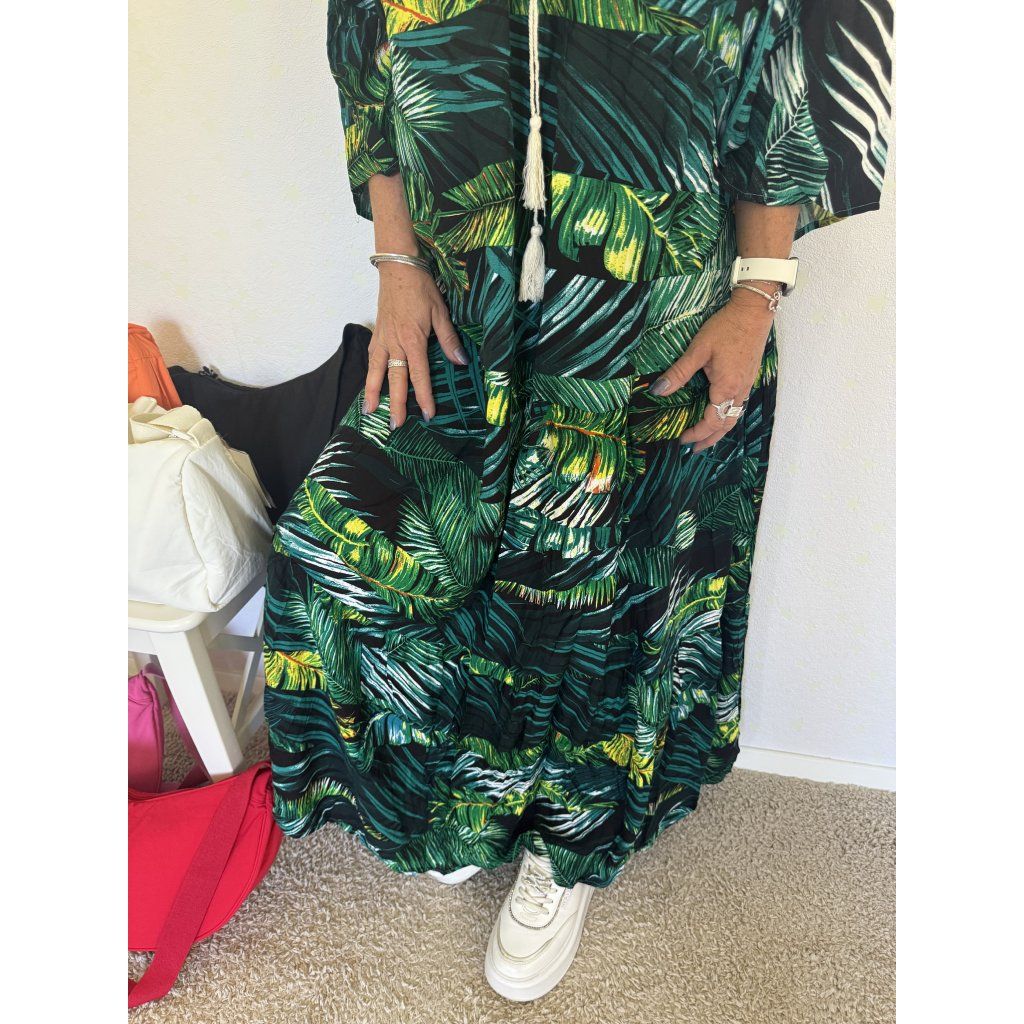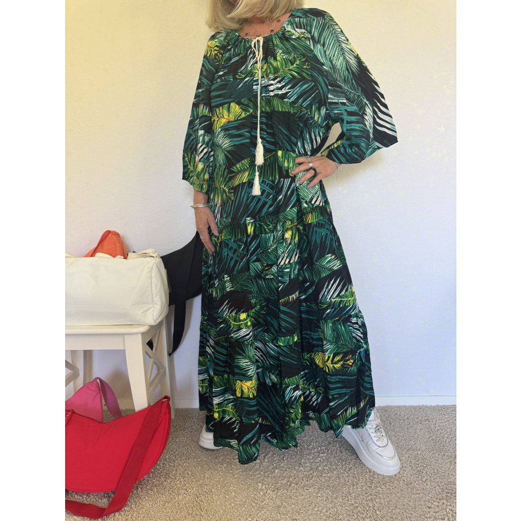 Lehké a vzdušné maxi šaty z příjemného, prodyšného materiálu v živém zeleno-černém palmovém designu.