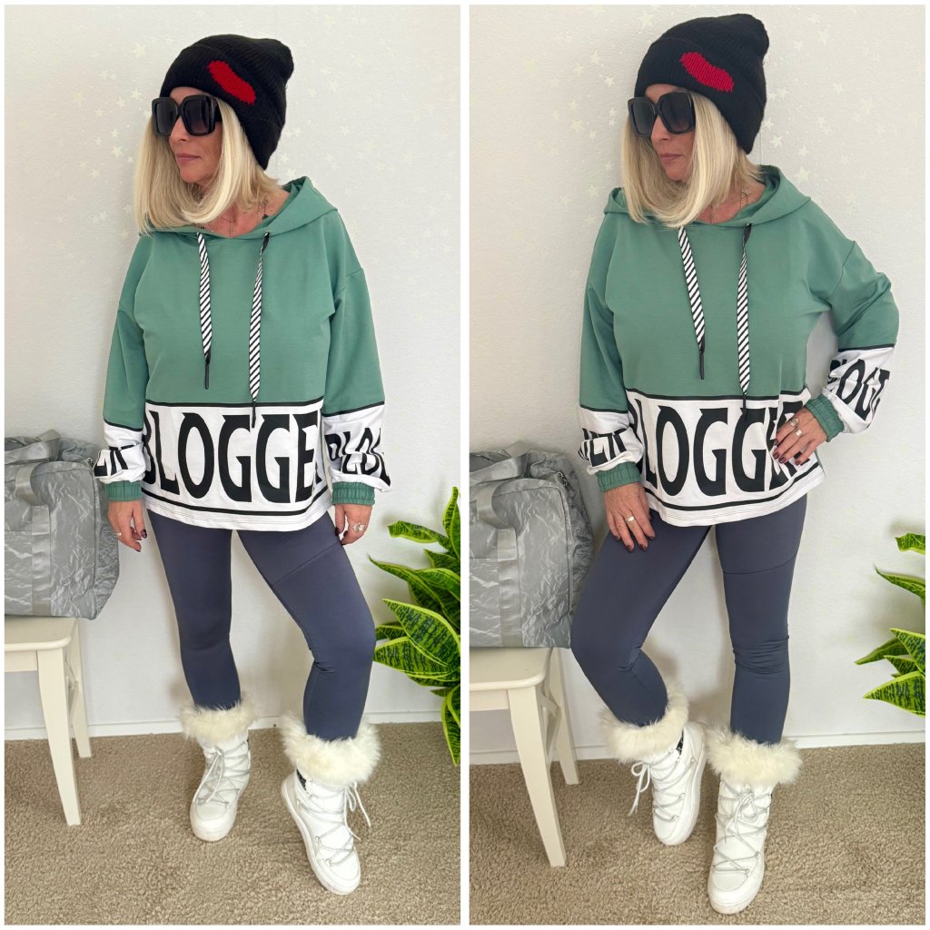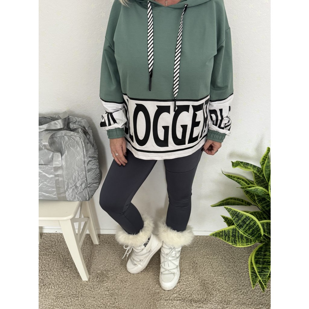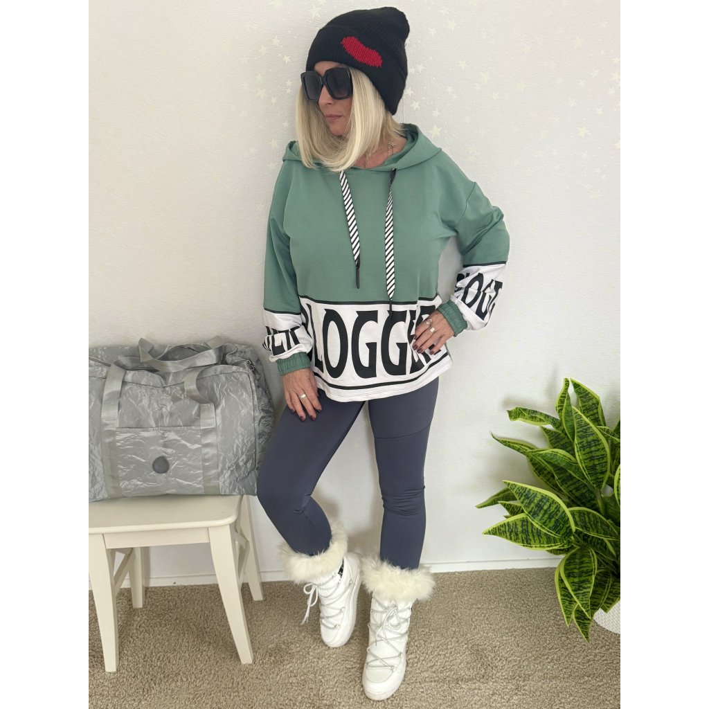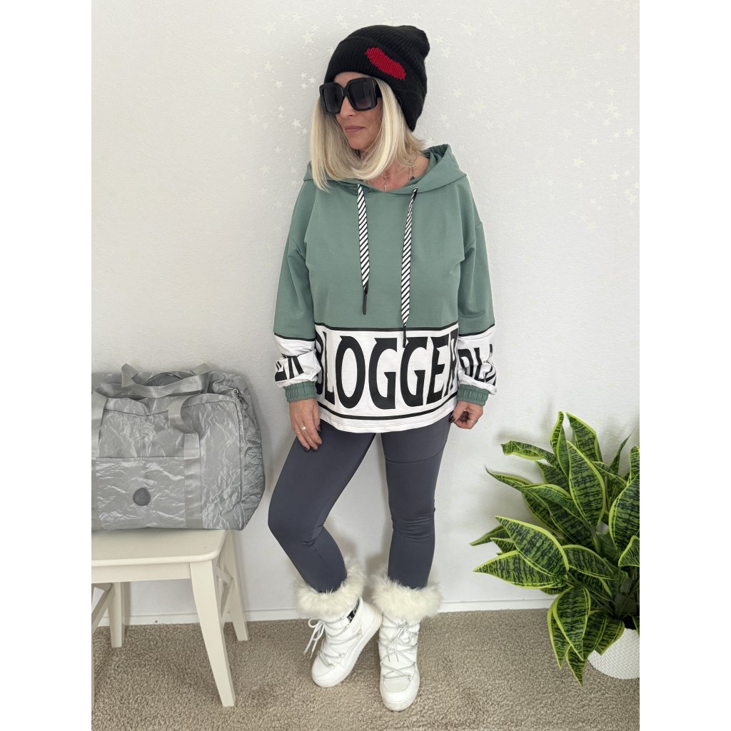 Stylová oversize mikina s kapucí v trendy zelené barvě s výrazným nápisem.