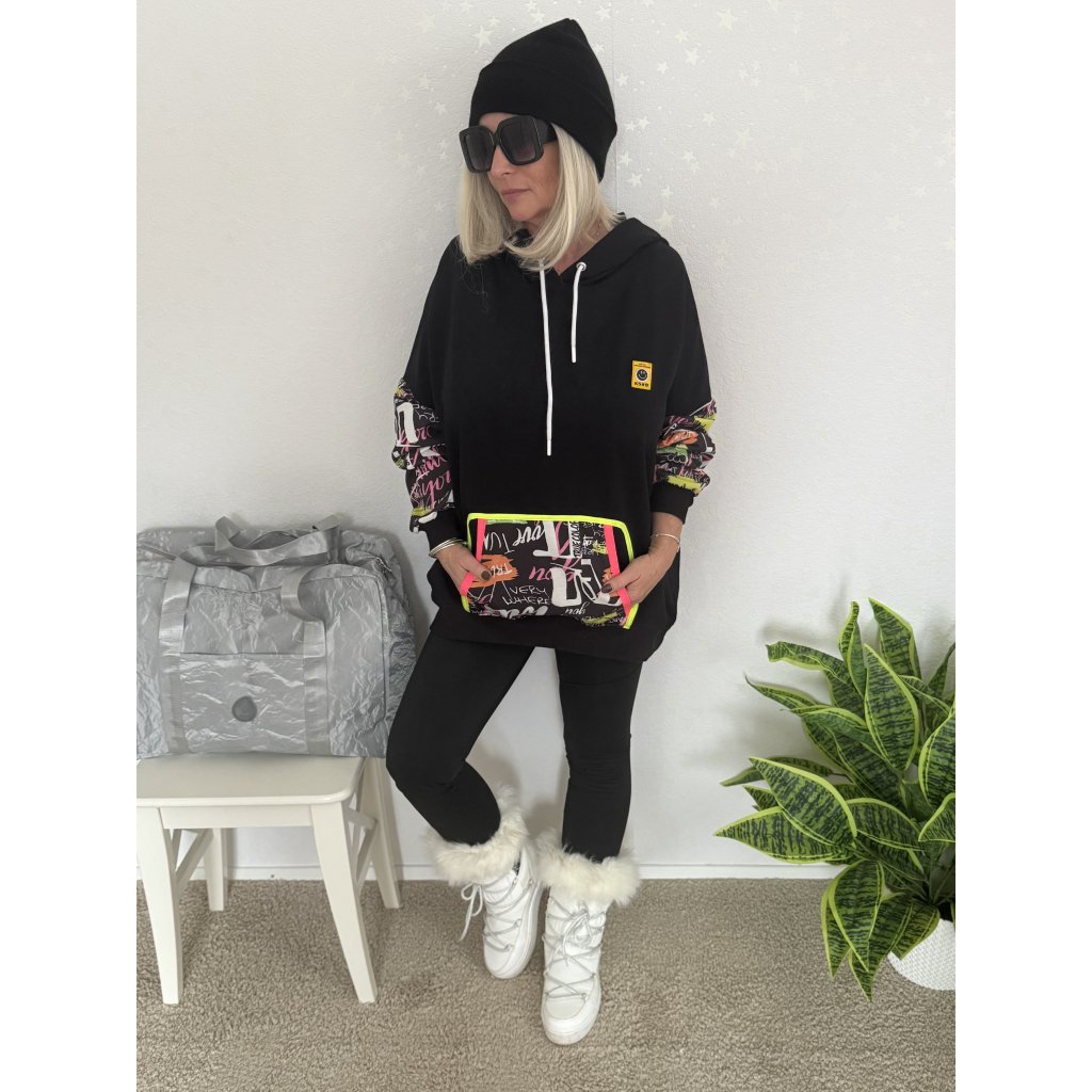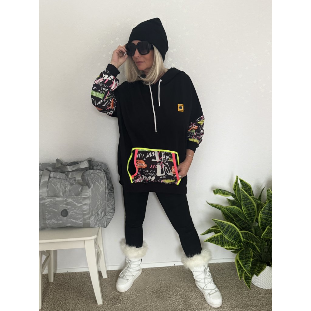 Stylová černá oversize mikina s kapucí a barevnými abstraktními prvky na rukávech a spodku je dokonalým kouskem pro ty, které chtějí vyniknout.