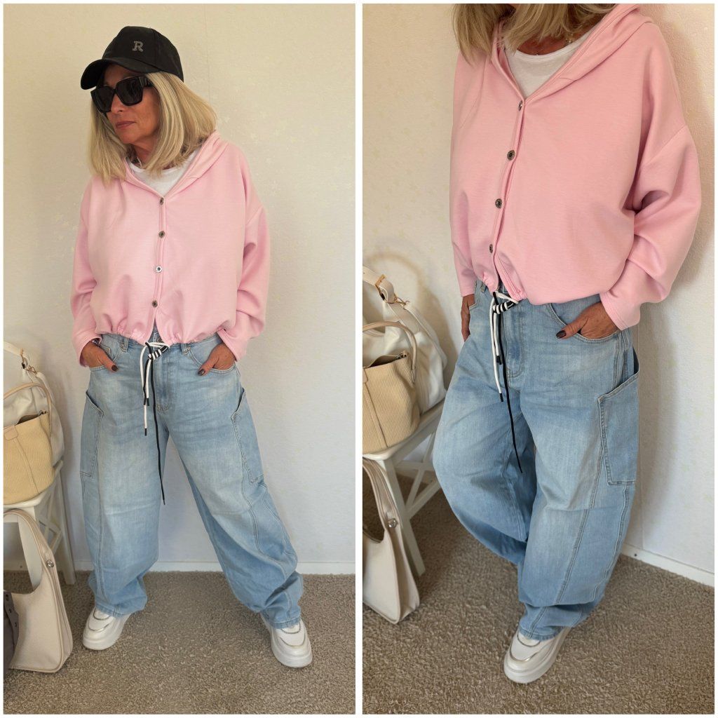 Barevný mikinový kardigan s knoflíky, kapucí a volným střihem.