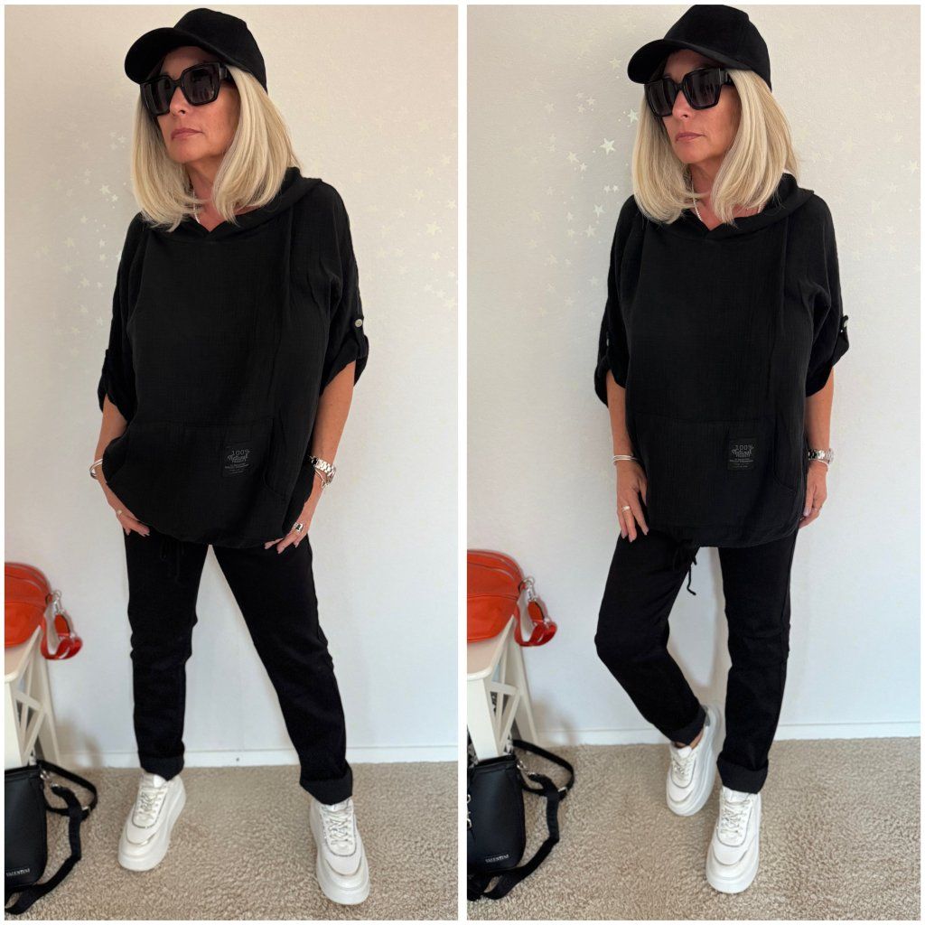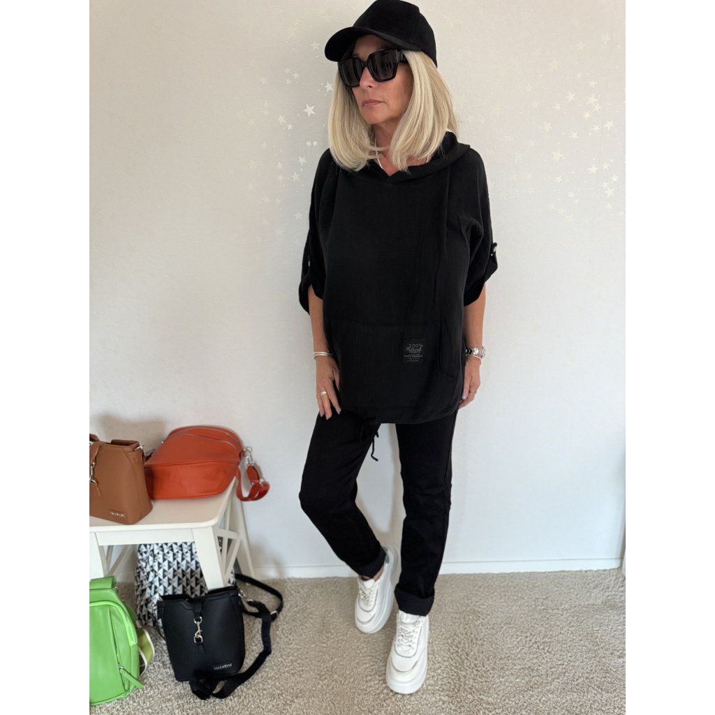 Jemňoučký mušelínový materiál (100 % přírodní bavlna) s typickou lehce zvrásněnou strukturou, oversize střih s kapucí, velkým předním klokaním kapsou s volnými 3/4 rukávy s možností vyhrnout.