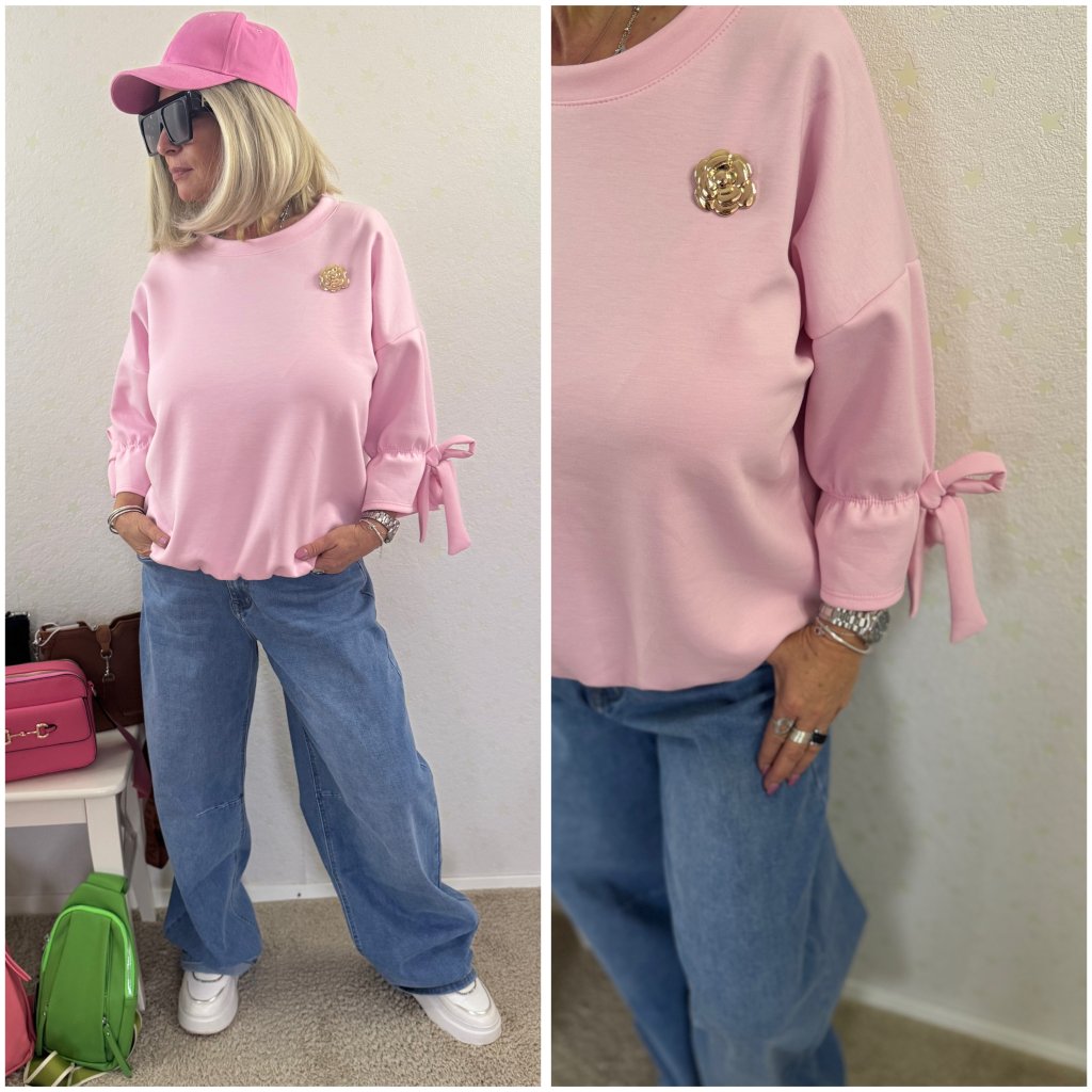 Pohodlný oversize mikinový top s mašličkami na rukávech – měkký, lehký materiál, volný střih a 3/4 rukávy zakončené stahovacími mašlemi pro hravý look.