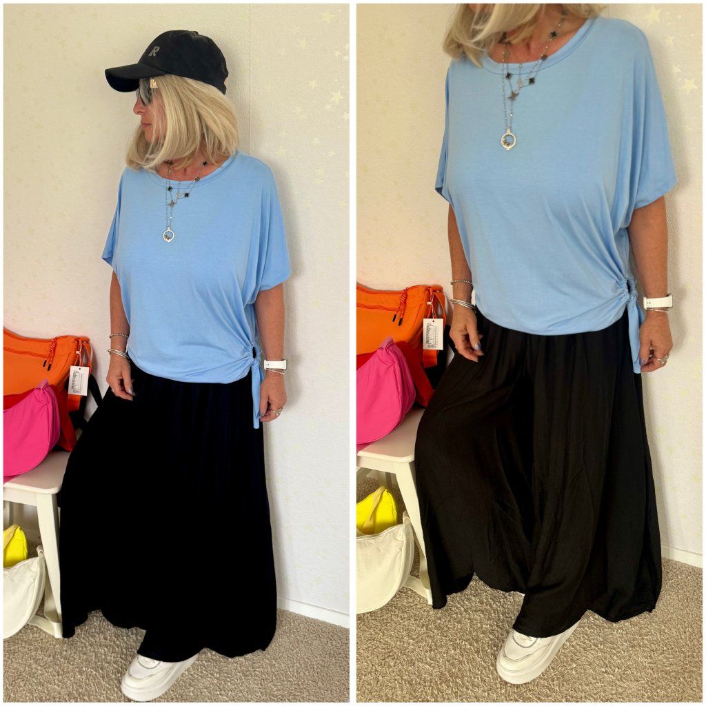 Volný střih s krátkým rukávem a kulatým výstřihem je skvěle univerzální. Perfektně se hodí k širokým kalhotám, sukním i legínám.