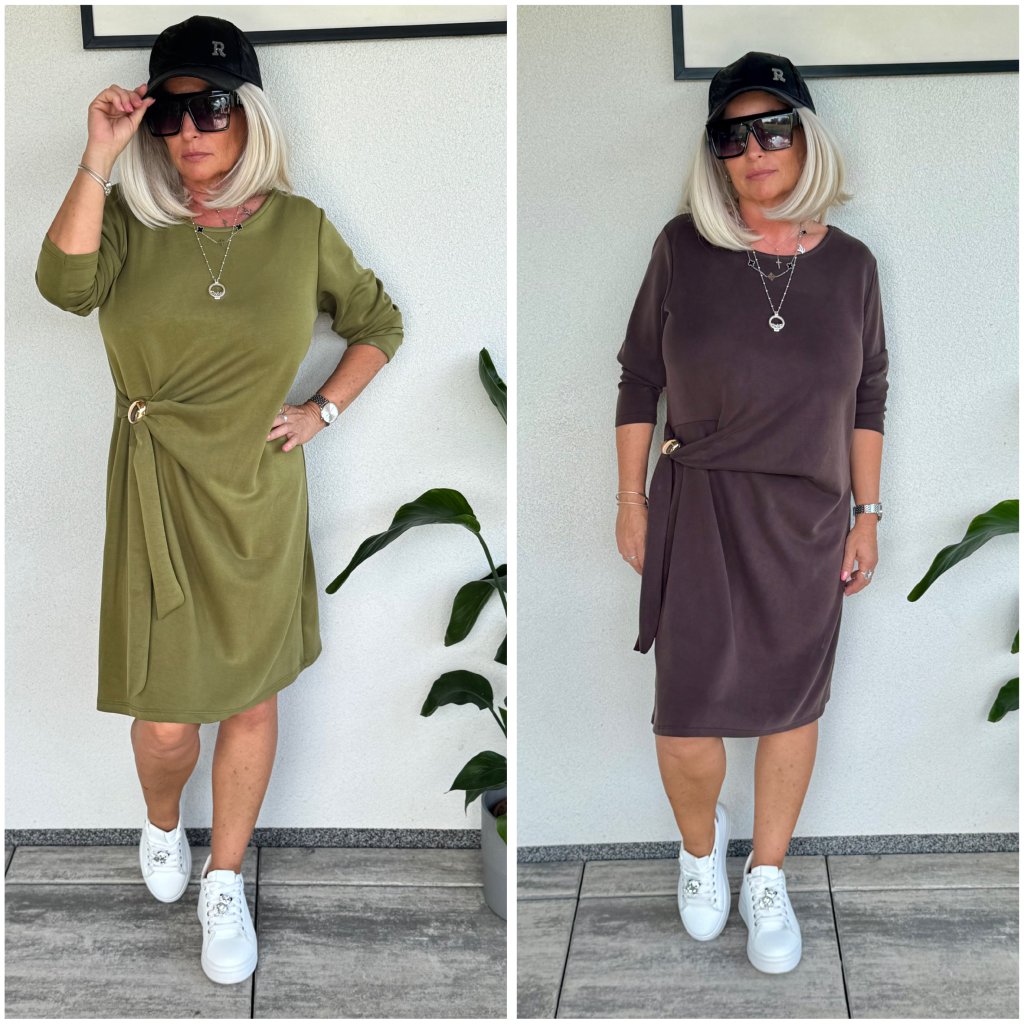 Tyto šaty s elegantním detailem na boku jsou skvělou volbou pro ženy, které chtějí vypadat stylově a zároveň se cítit pohodlně. Příjemný měkký materiál, jednoduchý střih a pásek se zlatou sponou krásně zvýrazní postavu, aniž by omezoval pohyb.