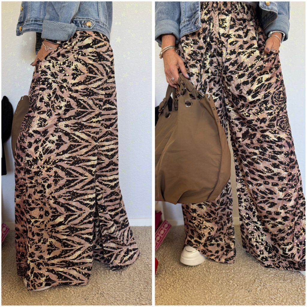 Výrazný geometrický vzor dodává kalhotám moderní a svěží vzhled. Ideální na teplé letní dny, dovolenou i elegantní denní look.