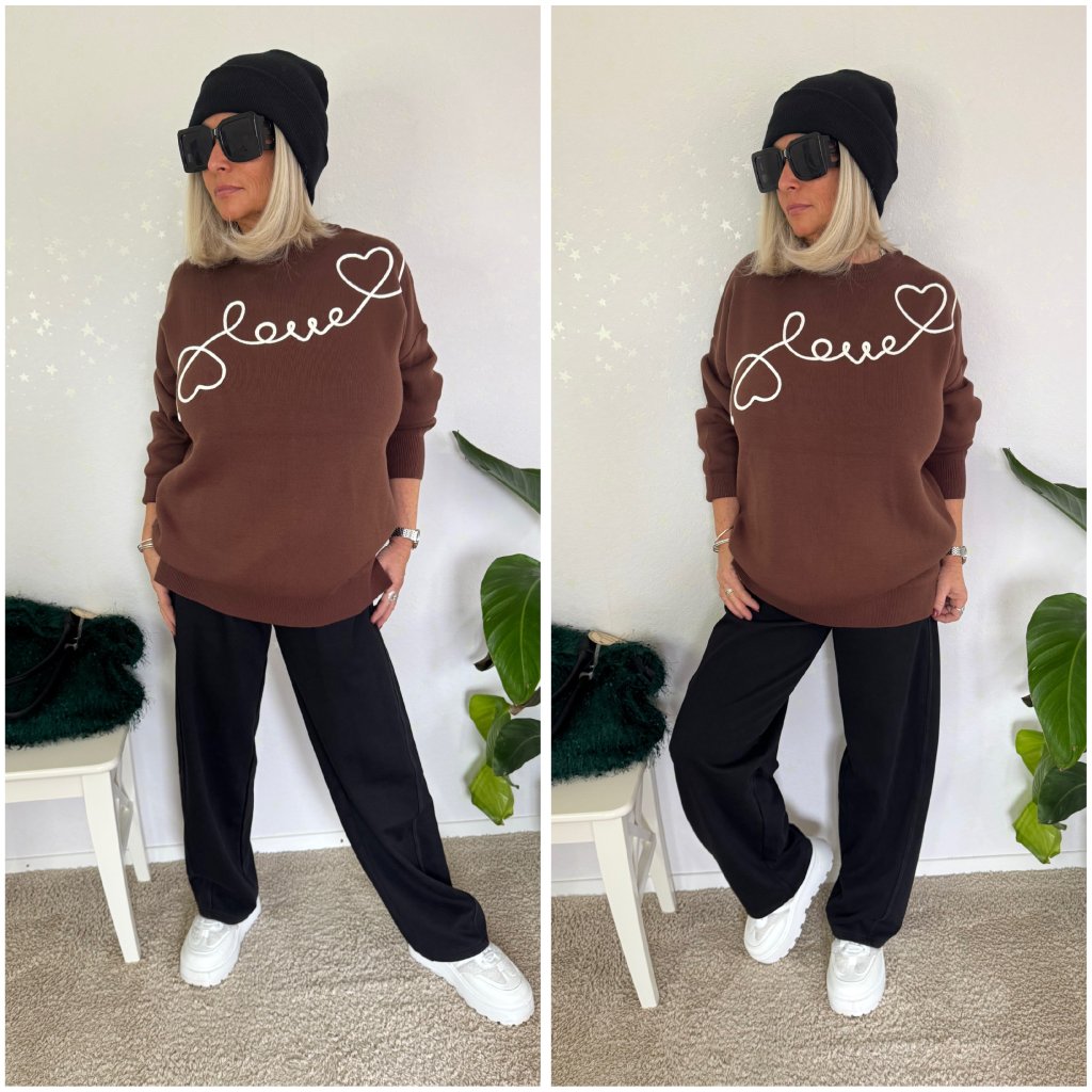 Svetřík Love s podílem vlny je ideální volbou pro chladnější dny – příjemně zahřeje a zároveň zaujme originálním designem s vyšitým nápisem a srdíčky.
