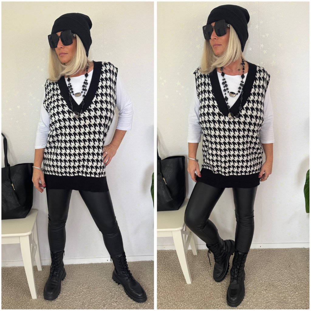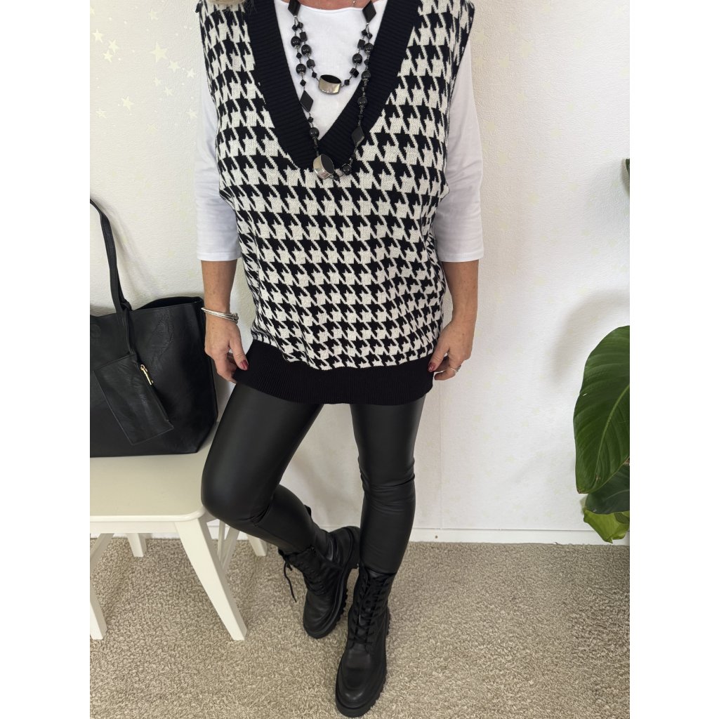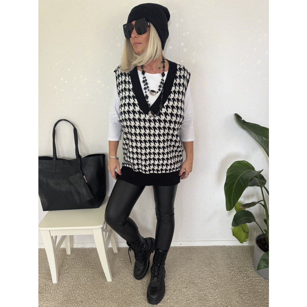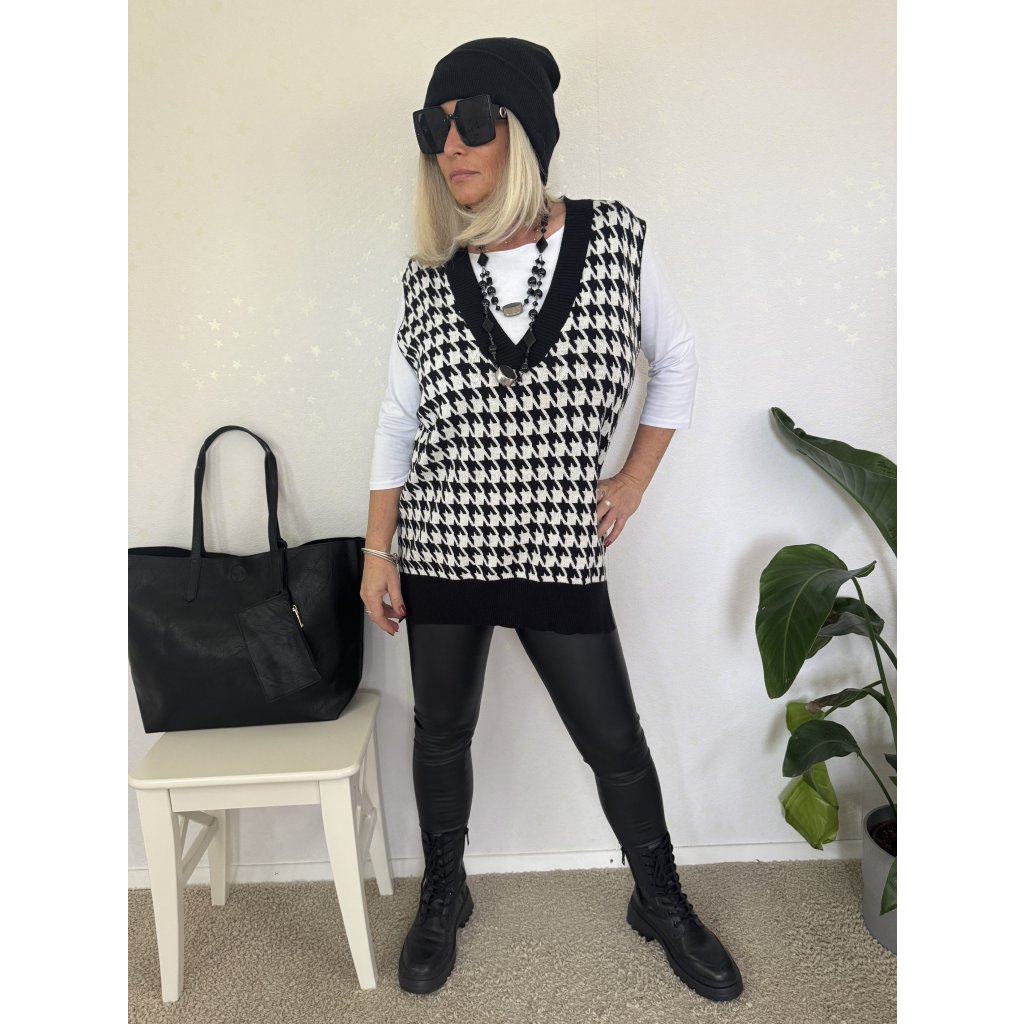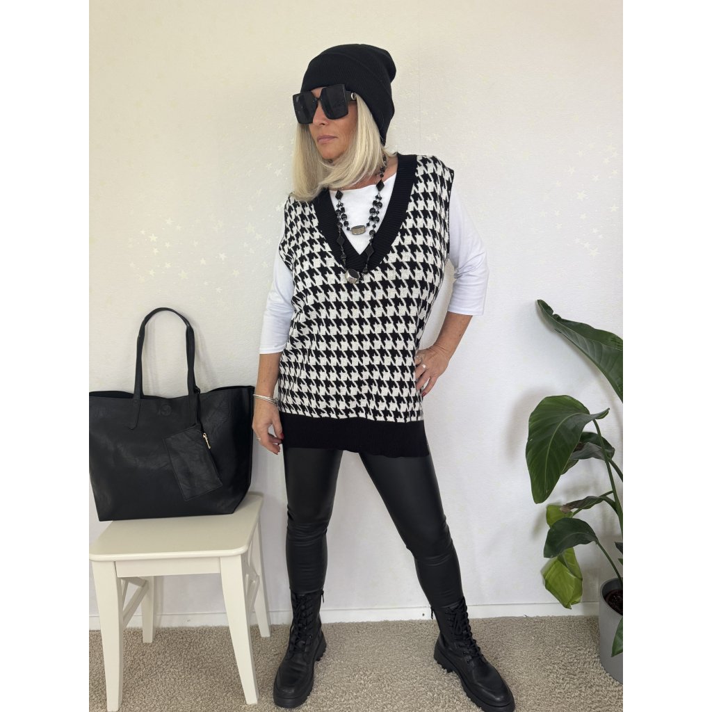 Stylová vestička v barevném kontrastu černé a bílé s efektním vzorem kohoutí stopy je skvělým doplňkem do vašeho šatníku.