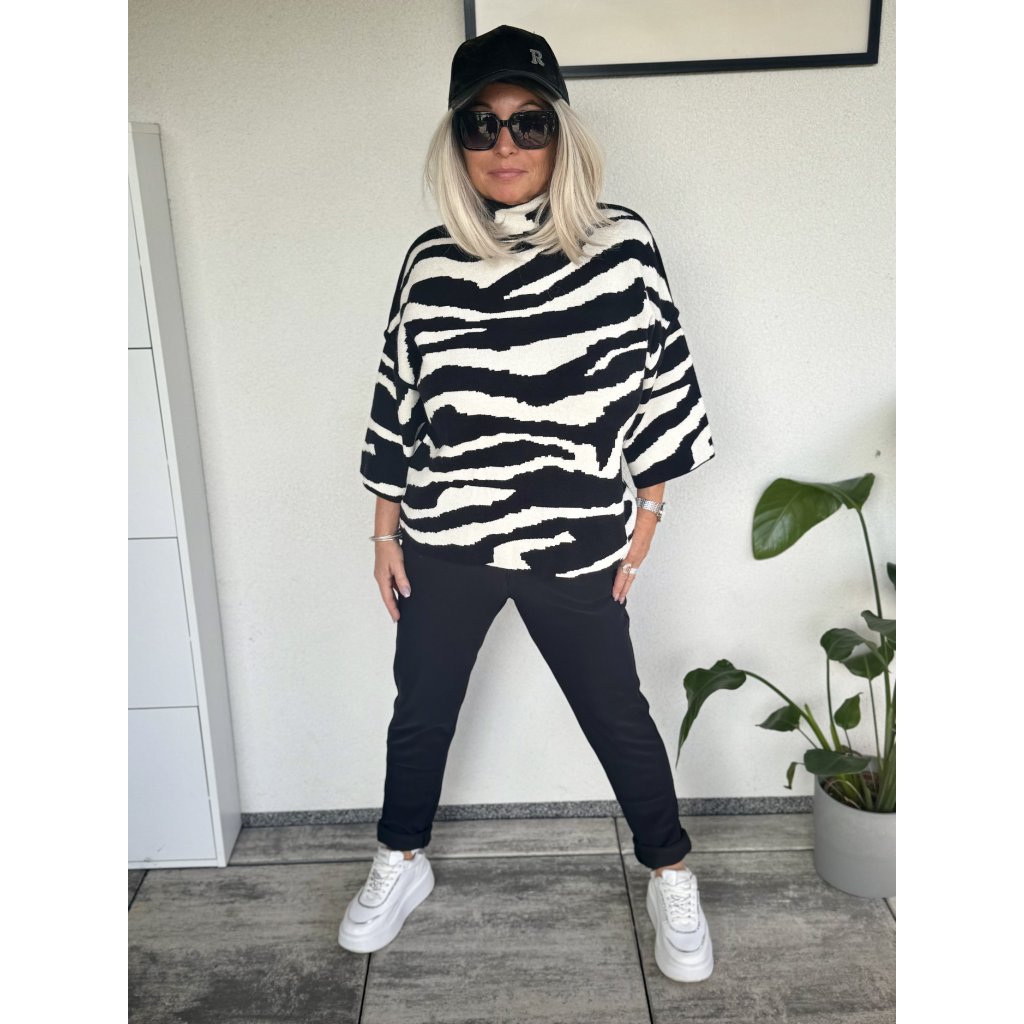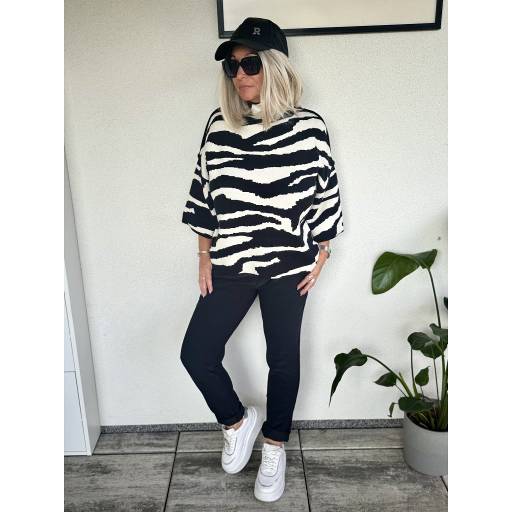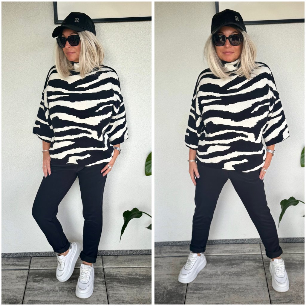 Moderní grafický motiv - svetry zdobí výrazný abstraktní vzor v kontrastní černo-bílé nebo bílo-smetanové-černé variantě.